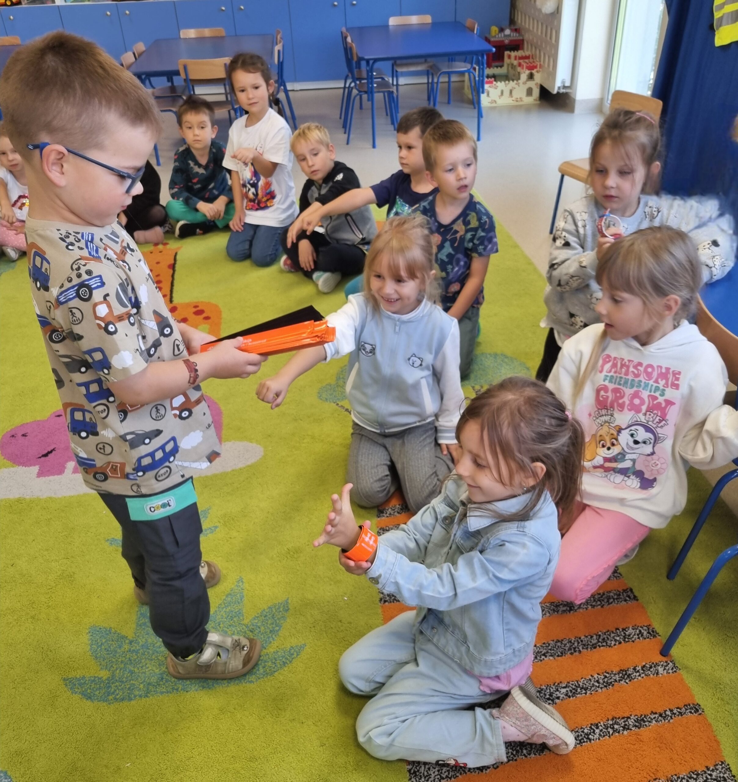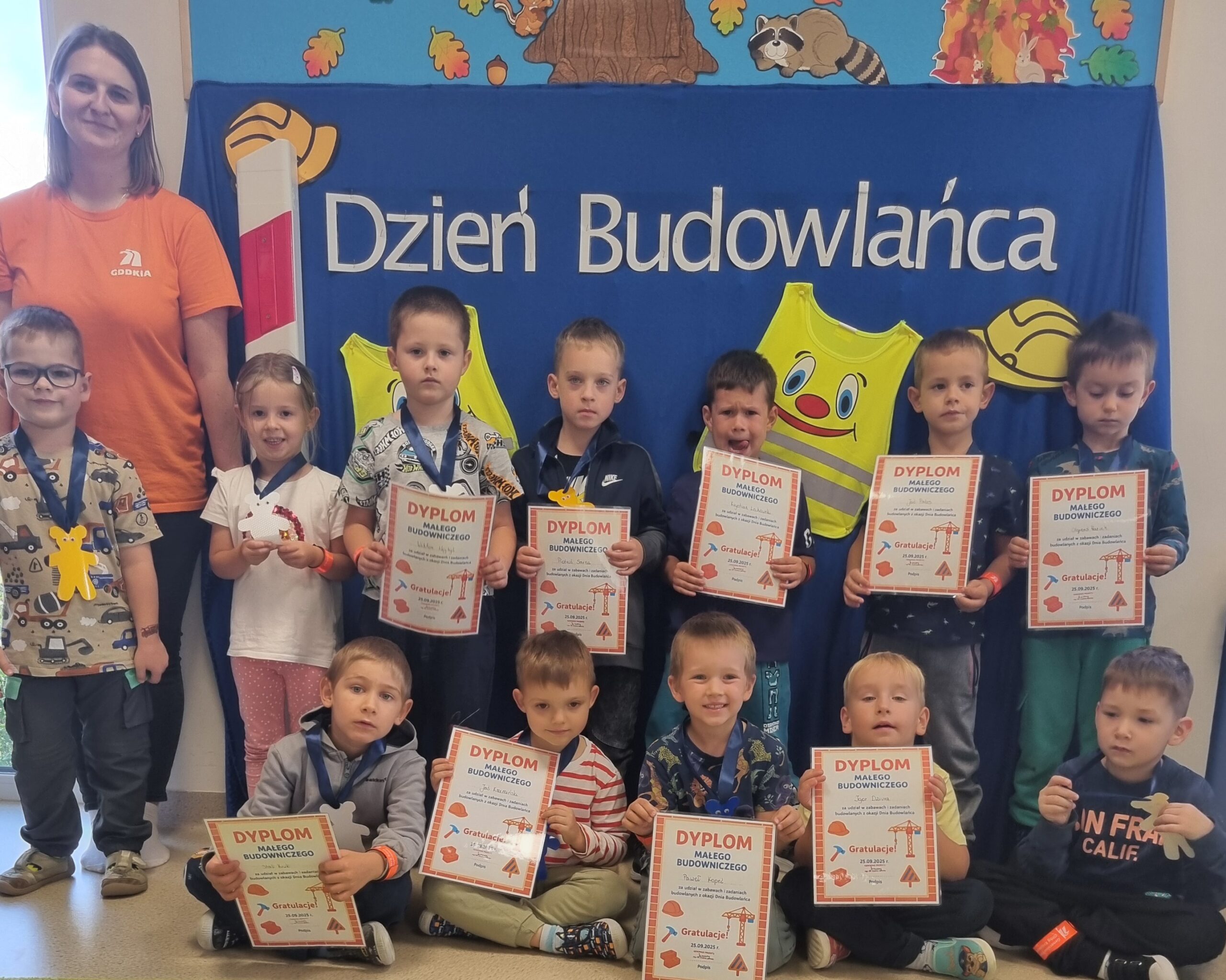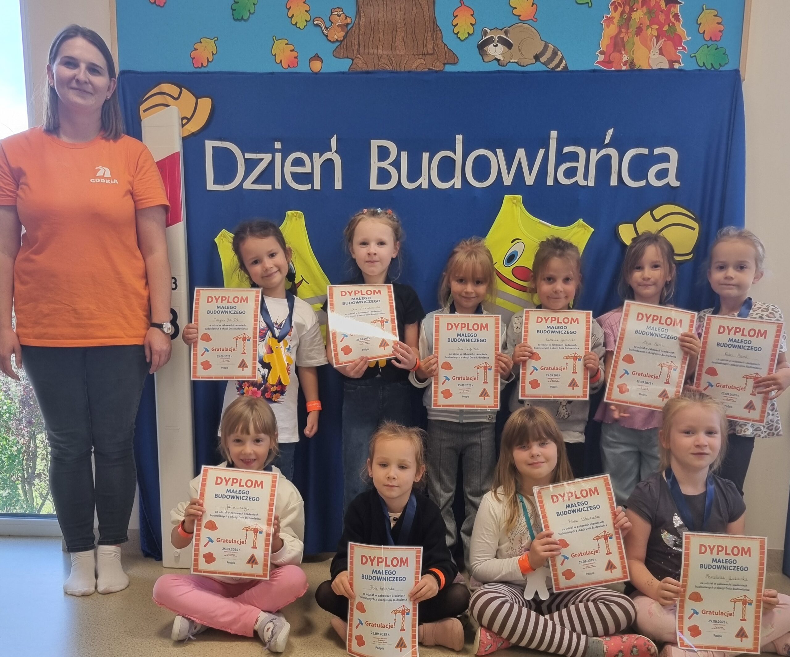 „Dzień Budowlańca”, który świętowany jest 25 września był okazją, by przedszkolakom przedstawić ten ważny zawód. W ramach cyklu zajęć „Poznajemy pracę naszych rodziców” mieliśmy zaszczyt gościć mamę Olusia, która pokazała dzieciom, jak wygląda proces budowania drogi, jakie pojazdy i maszyny ułatwiają pracę na budowie oraz jak odpowiednio się ubrać, aby zapewnić bezpieczeństwo podczas pracy. Dzieci miały możliwość przymierzenia kasków i innych elementów stroju budowlańca, a także oglądały narzędzia i próbowały posługiwać się nimi. Na koniec przedszkolaki dostały upominki i dyplomy przygotowane przez mamę i Olusia z naszej grupy.