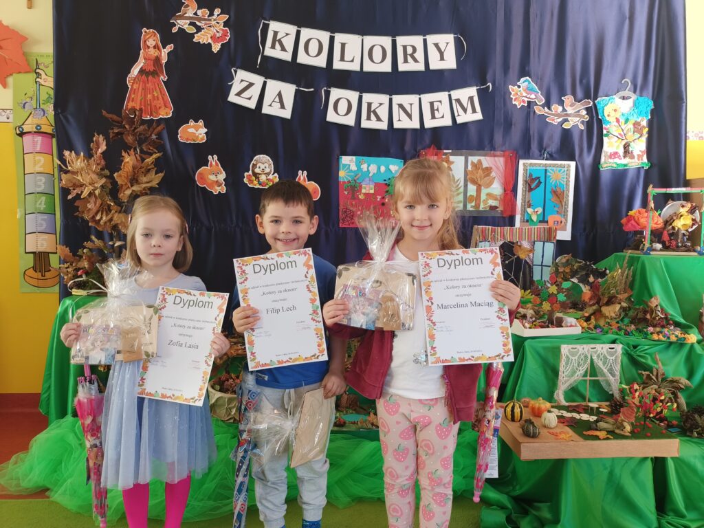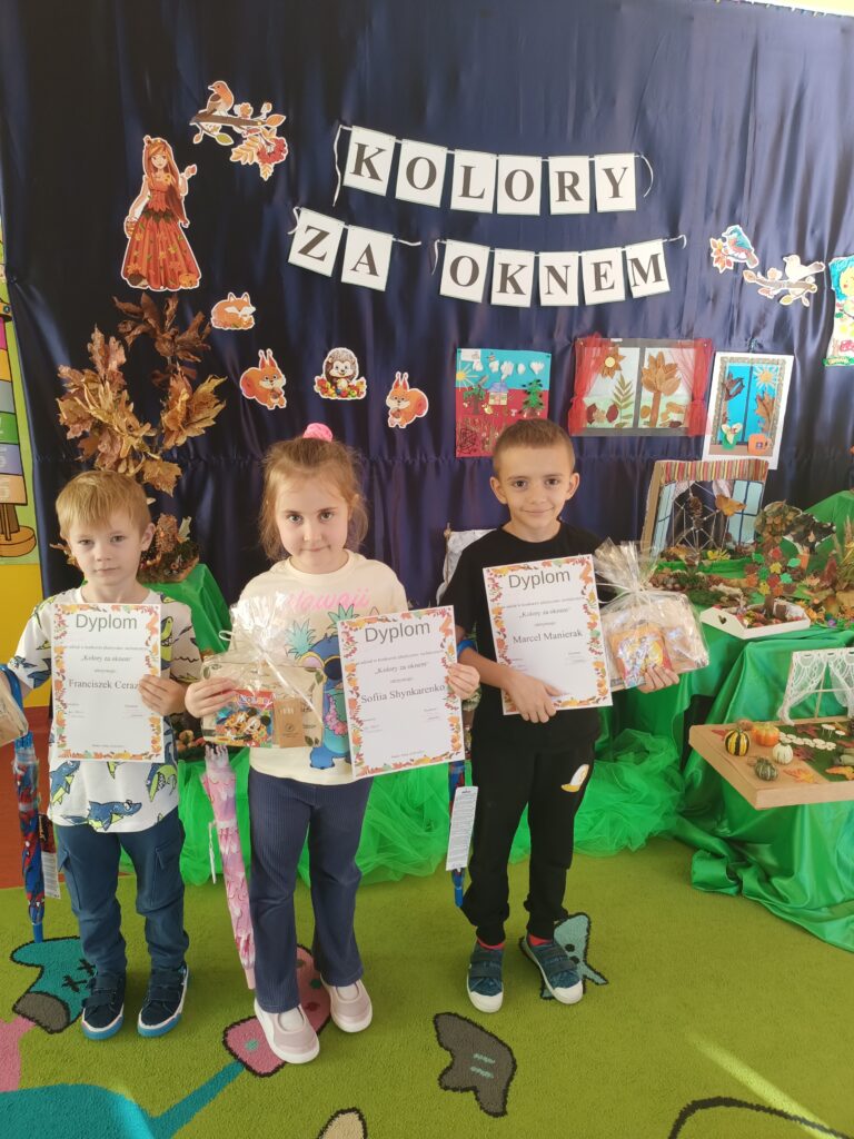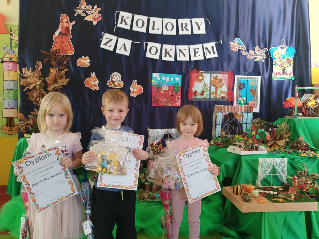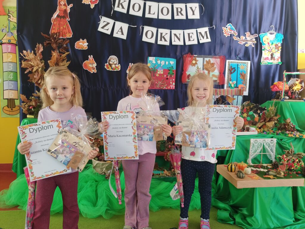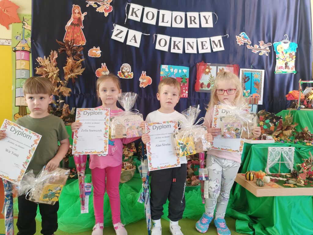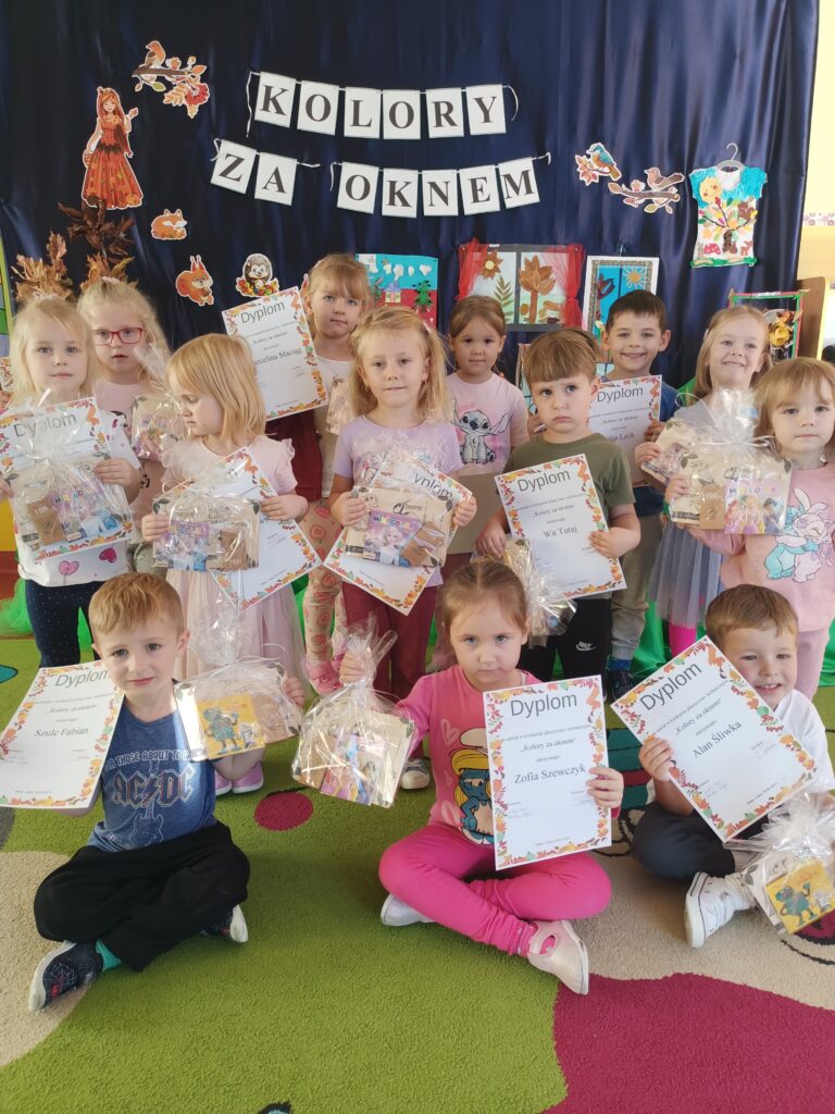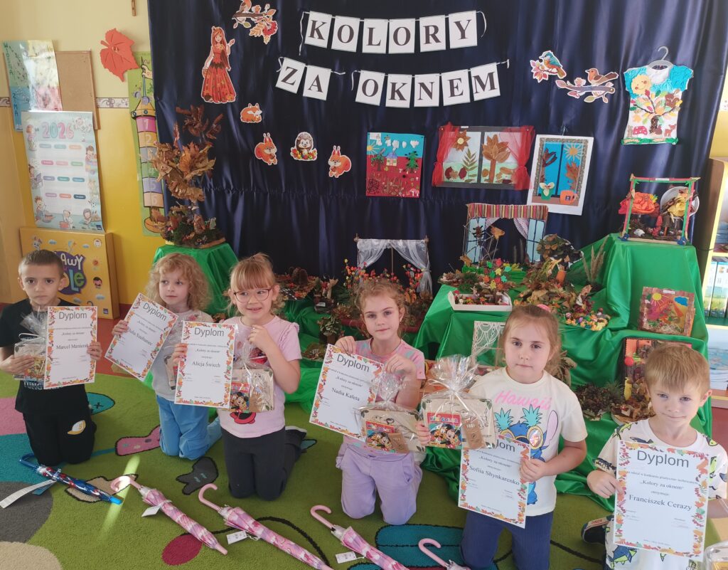 20 października 2025r. odbyło się rozstrzygnięcie konkursu plastyczno- technicznego pod hasłem ,,Kolory za oknem”, w którym wzięły udział dzieci z grupy III i IX. Celem konkursu było rozwijanie kreatywności i wrażliwości estetycznej oraz kształtowanie postawy uważnego obserwatora przyrody. Wszystkie prace wykonane zostały z niezwykłą starannością i pomysłowością, oddając prawdziwie jesienny nastrój. Każdy uczestnik otrzymał nagrodę i pamiątkowy dyplom.