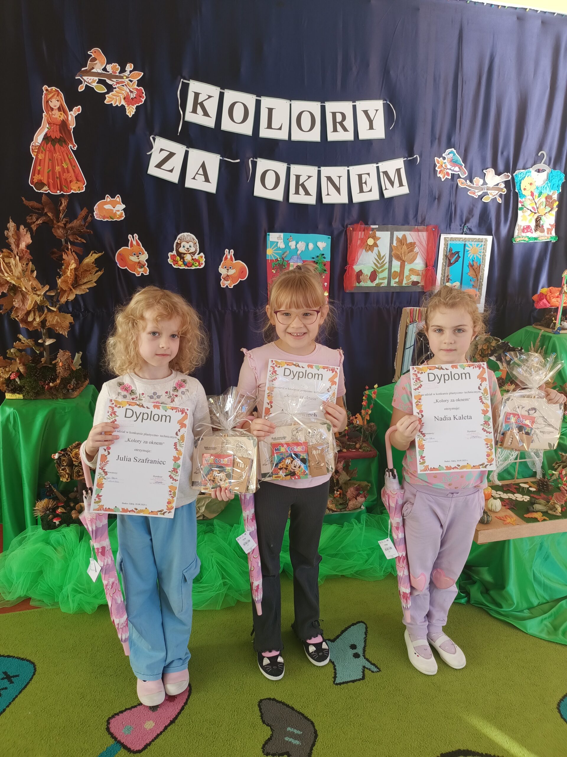 20 października 2025r. odbyło się rozstrzygnięcie konkursu plastyczno- technicznego pod hasłem ,,Kolory za oknem”, w którym wzięły udział dzieci z grupy III i IX. Celem konkursu było rozwijanie kreatywności i wrażliwości estetycznej oraz kształtowanie postawy uważnego obserwatora przyrody. Wszystkie prace wykonane zostały z niezwykłą starannością i pomysłowością, oddając prawdziwie jesienny nastrój. Każdy uczestnik otrzymał nagrodę i pamiątkowy dyplom.