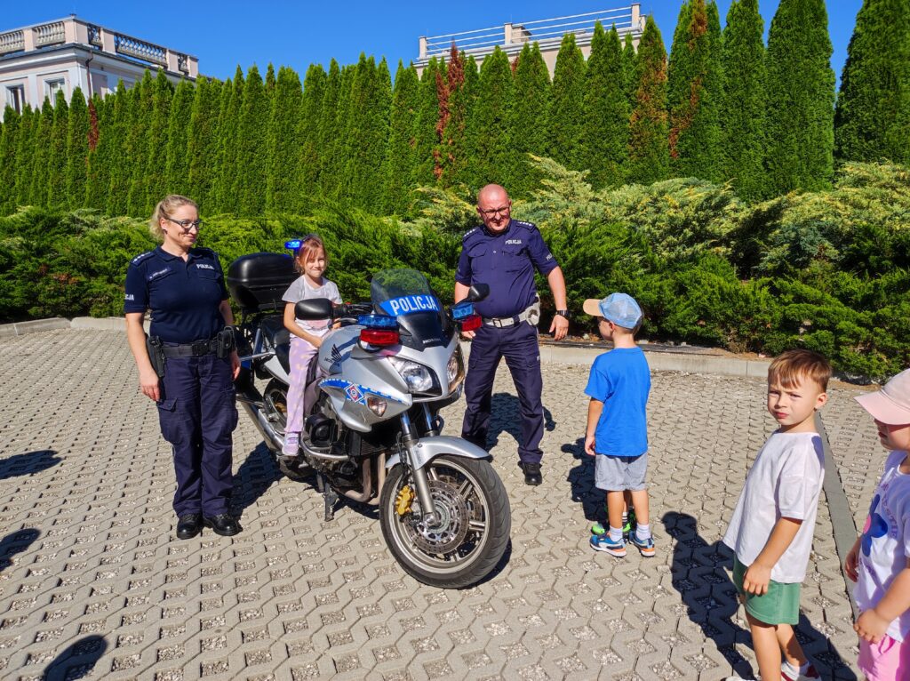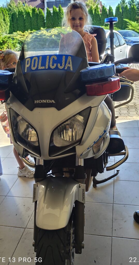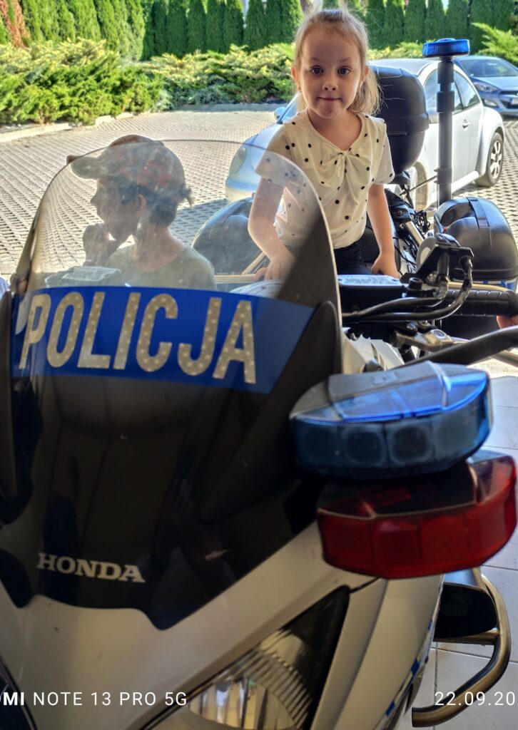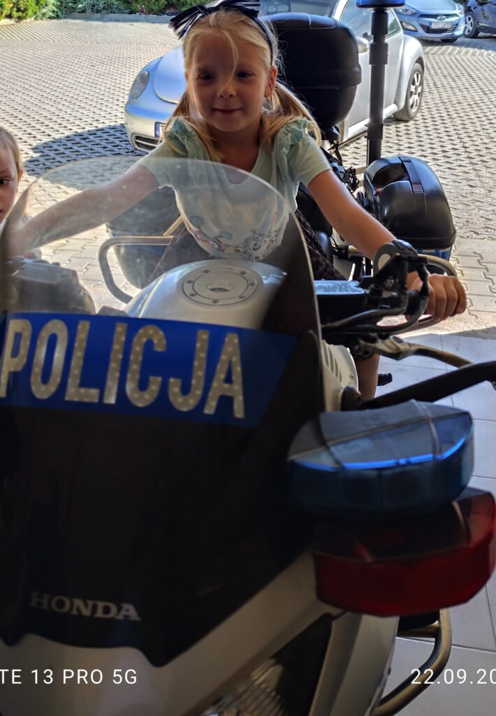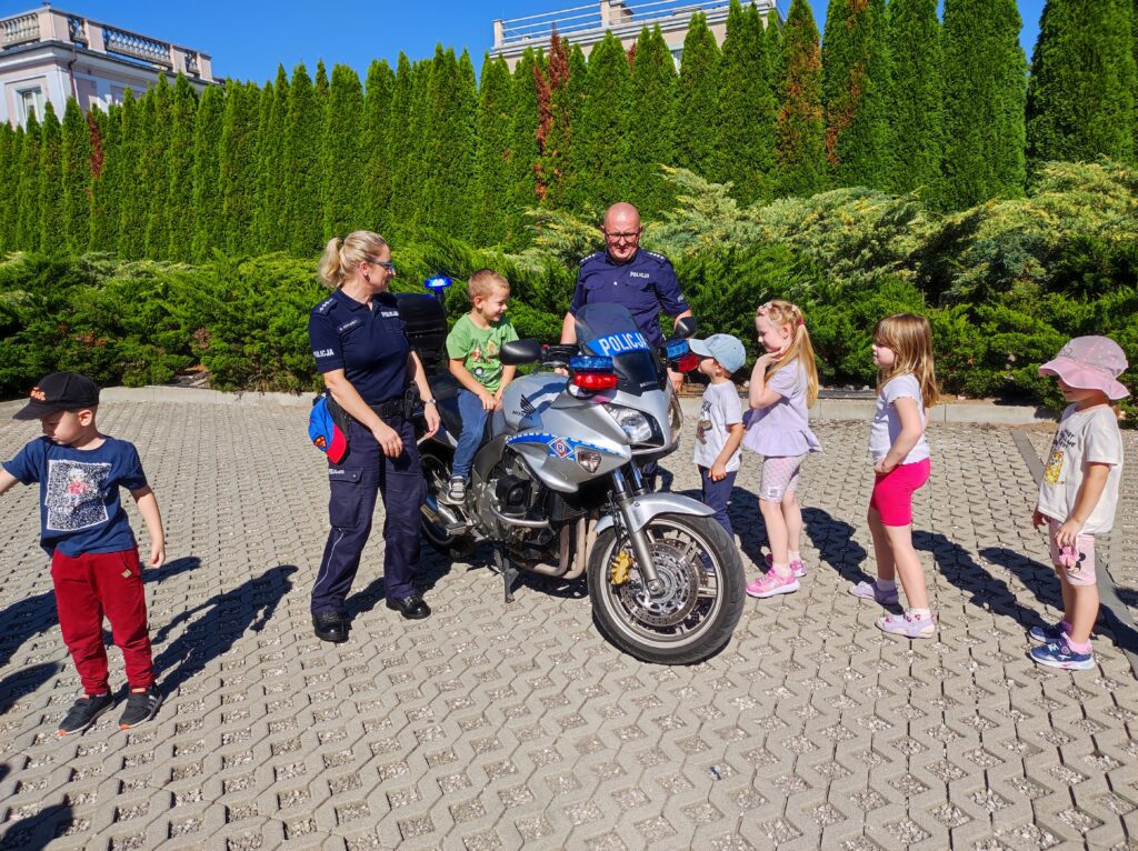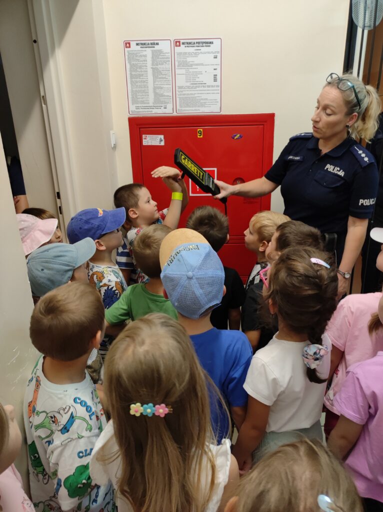 Na początku przedszkolaki zobaczyły stanowisko kierowania i dowiedziały się na czym polega praca policjantów pełniących tam służbę. Kolejnym miejscem był parking przed komendą i stojące na nim policyjne pojazdy. Każdy mógł wejść do samochodu policyjnego, usłyszeć i zobaczyć sygnały dźwiękowe i świetlne. Duże zainteresowanie wśród dzieci wzbudziły również policyjne motory. Z ogromnym zaciekawieniem słuchały opowiadań policjantów, dzięki którym zapoznały się ze specyfiką służby policjantów ruchu drogowego i prewencji. Dzieci zostały zaproszone również do gabinetu Komendanta Policji, który serdecznie ich powitał i poczęstował cukierkami. Pełni wrażeń, bogatsi o nową wiedzę wróciły do przedszkola.