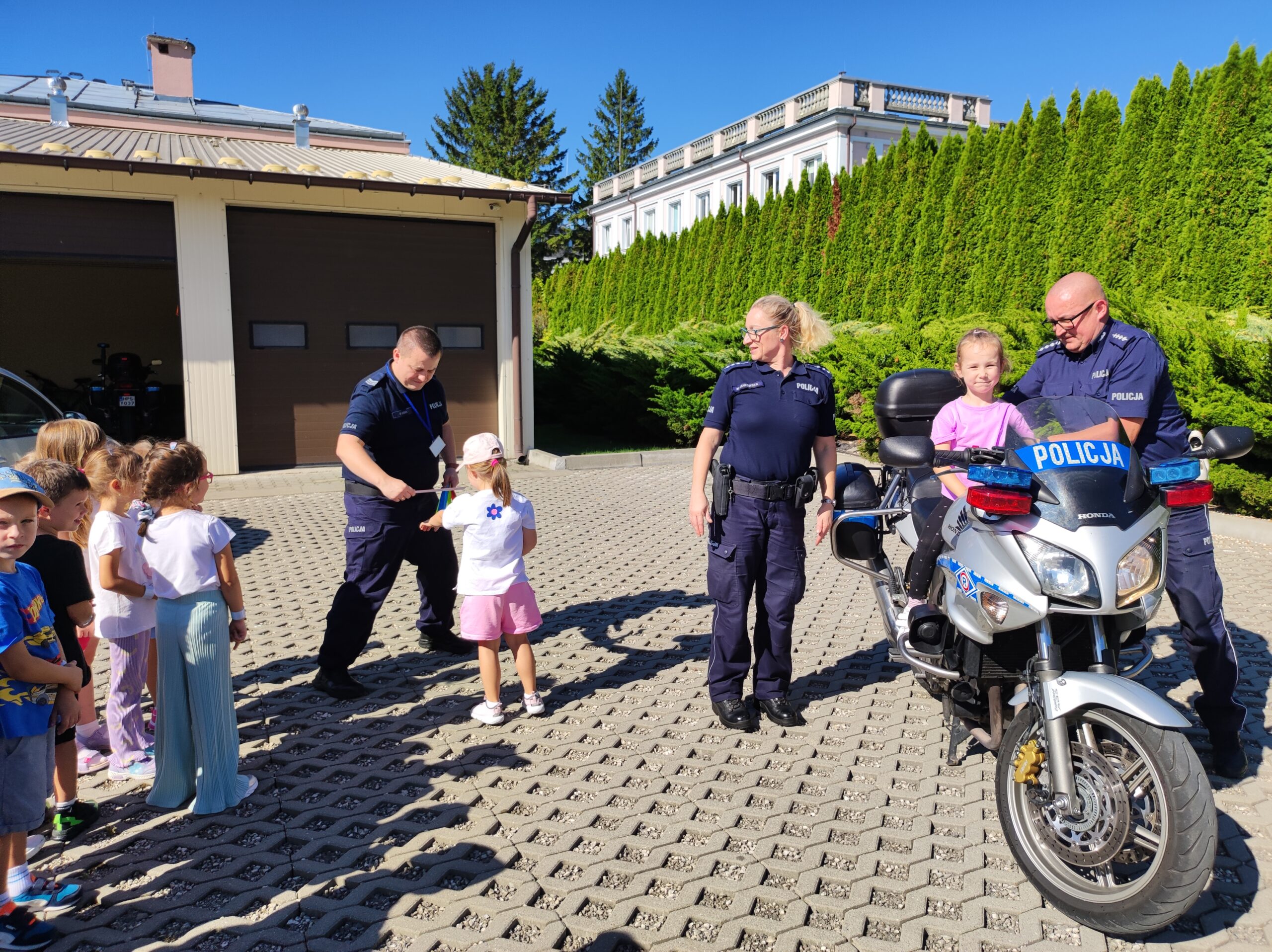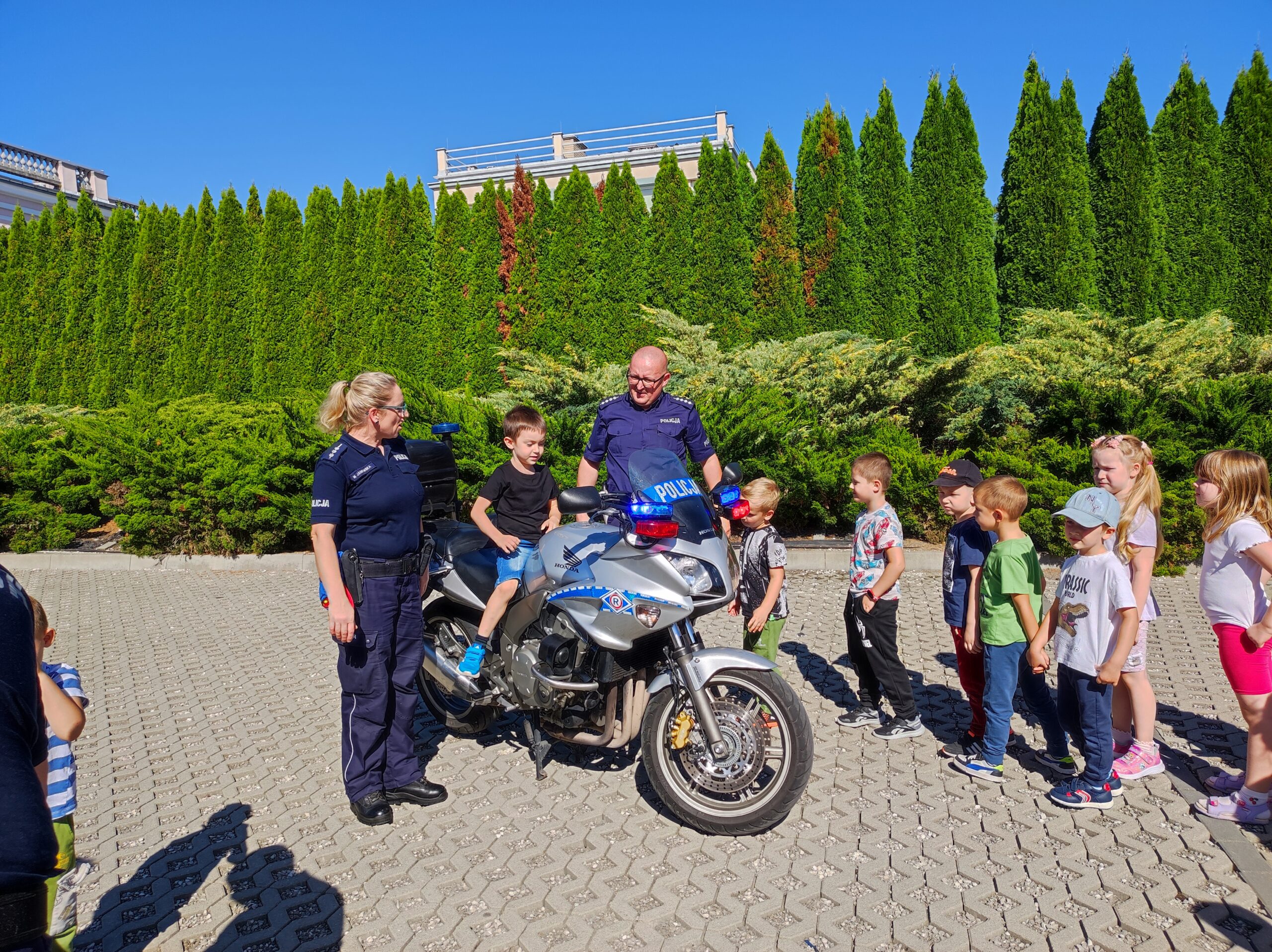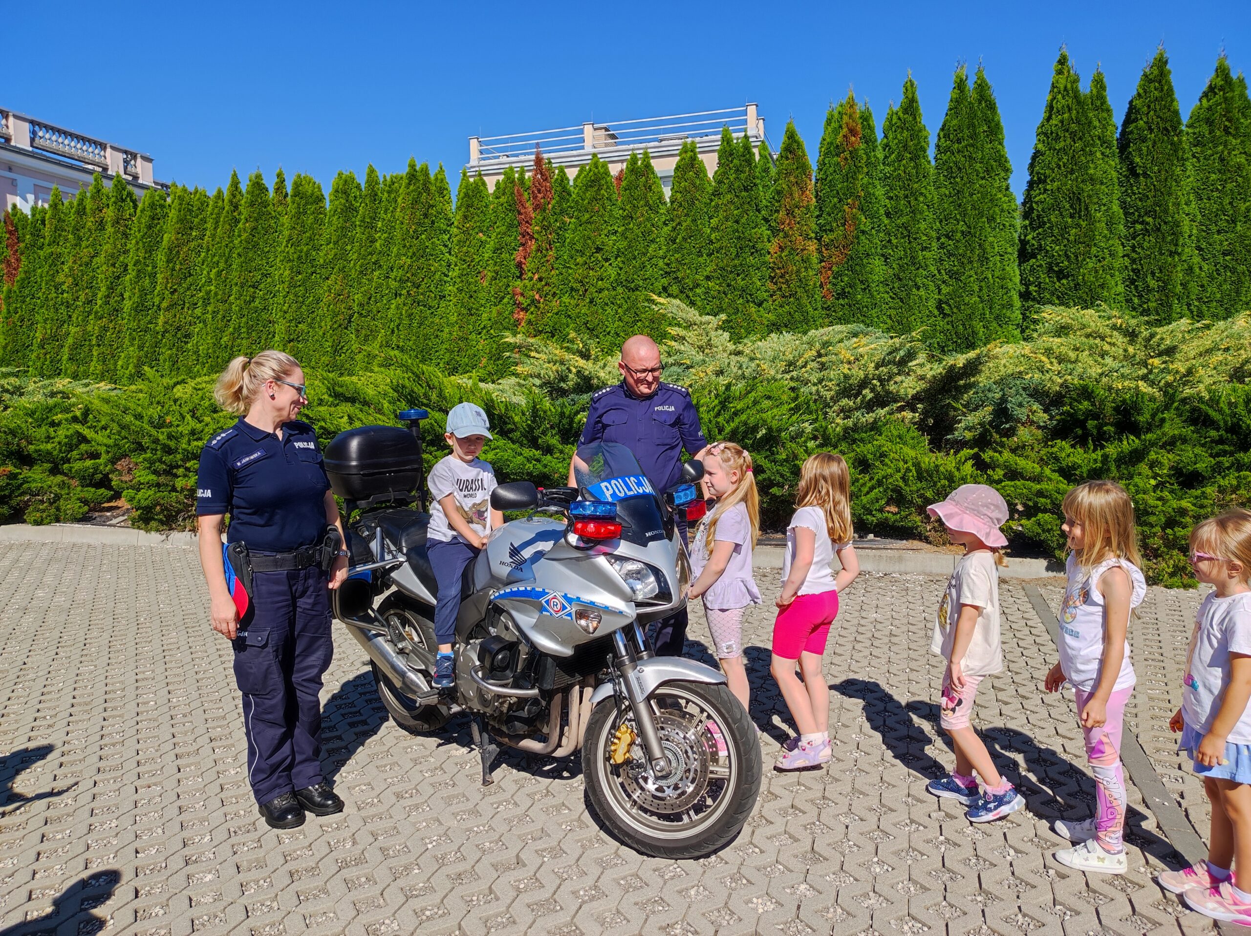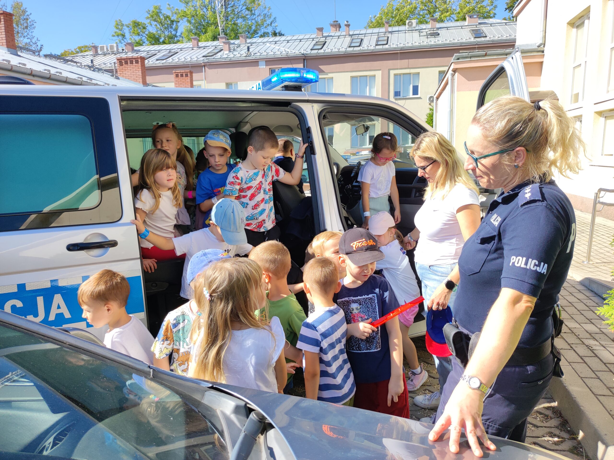 Na początku przedszkolaki zobaczyły stanowisko kierowania i dowiedziały się na czym polega praca policjantów pełniących tam służbę. Kolejnym miejscem był parking przed komendą i stojące na nim policyjne pojazdy. Każdy mógł wejść do samochodu policyjnego, usłyszeć i zobaczyć sygnały dźwiękowe i świetlne. Duże zainteresowanie wśród dzieci wzbudziły również policyjne motory. Z ogromnym zaciekawieniem słuchały opowiadań policjantów, dzięki którym zapoznały się ze specyfiką służby policjantów ruchu drogowego i prewencji. Dzieci zostały zaproszone również do gabinetu Komendanta Policji, który serdecznie ich powitał i poczęstował cukierkami. Pełni wrażeń, bogatsi o nową wiedzę wróciły do przedszkola.