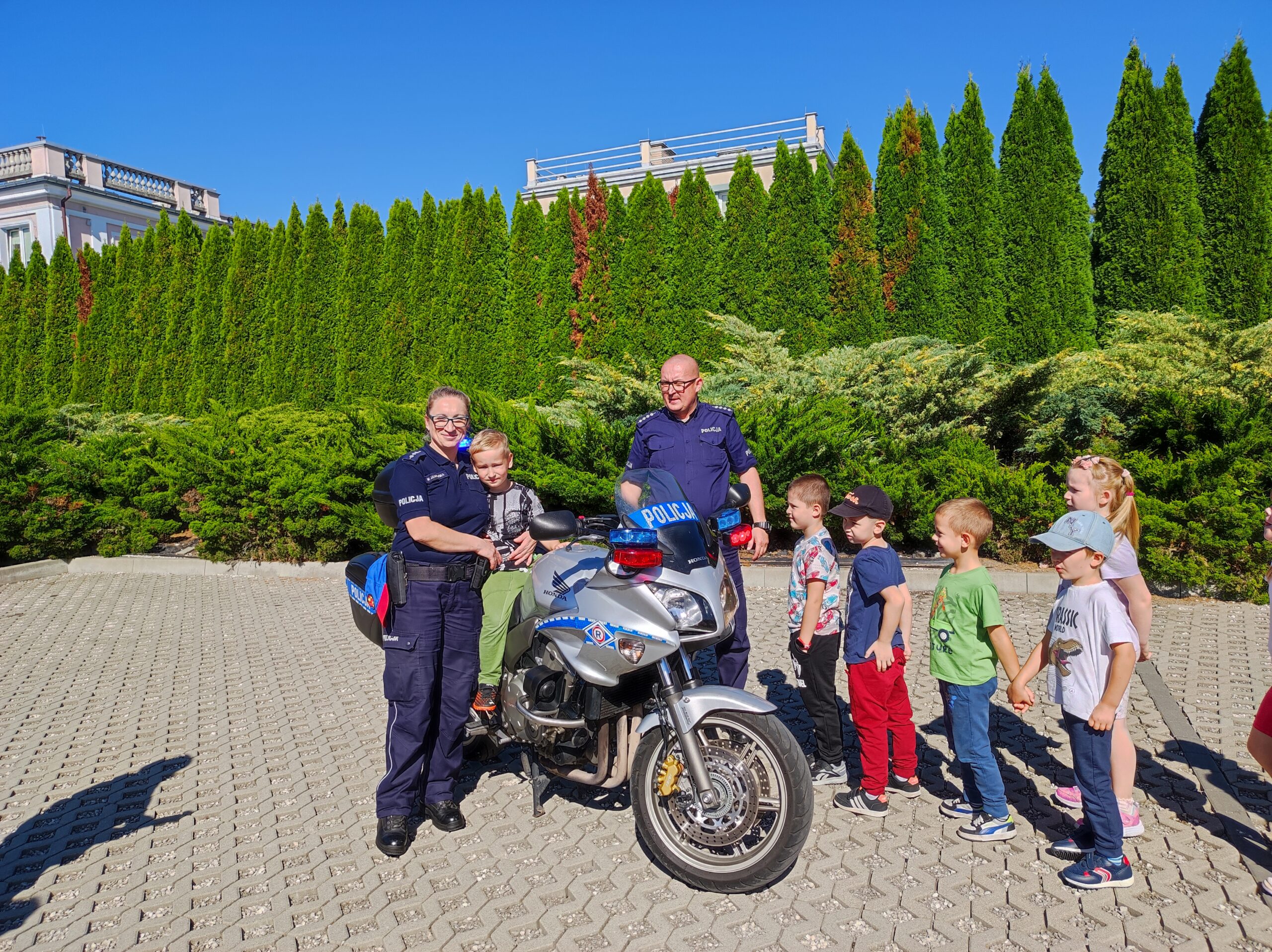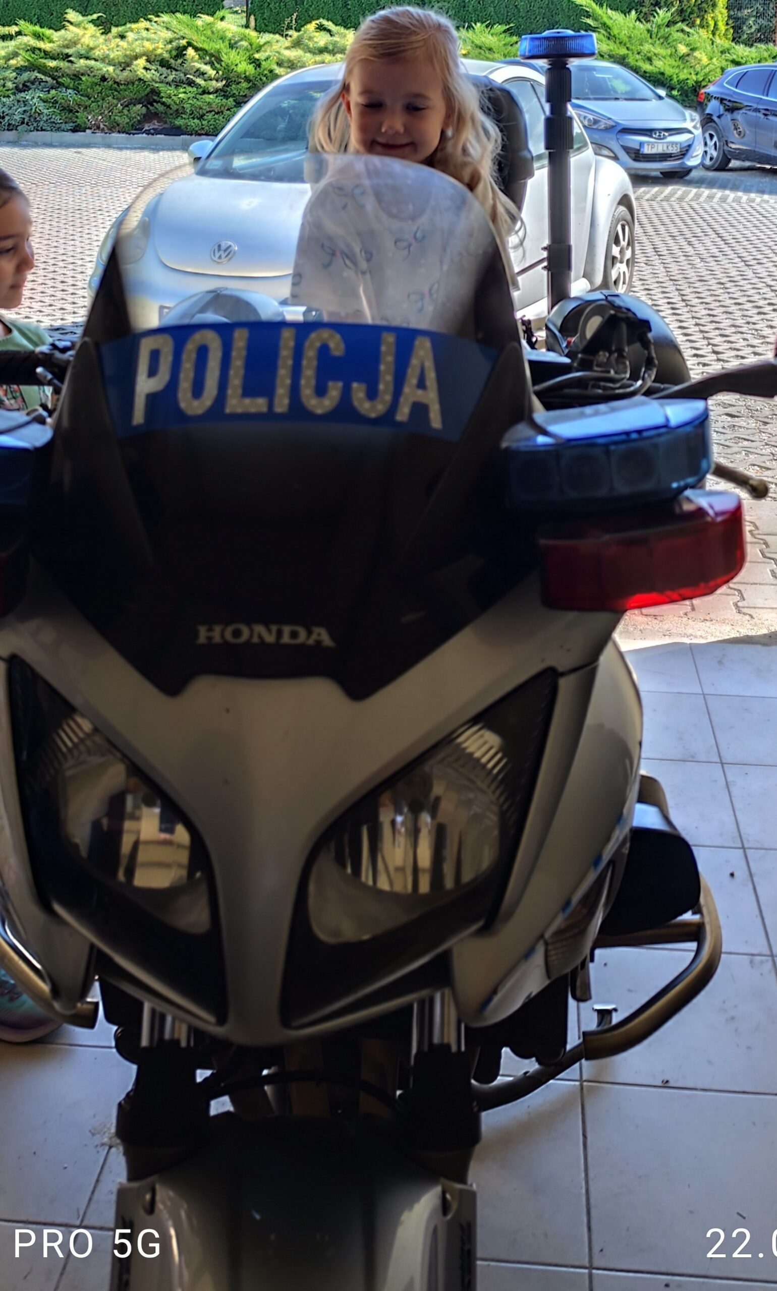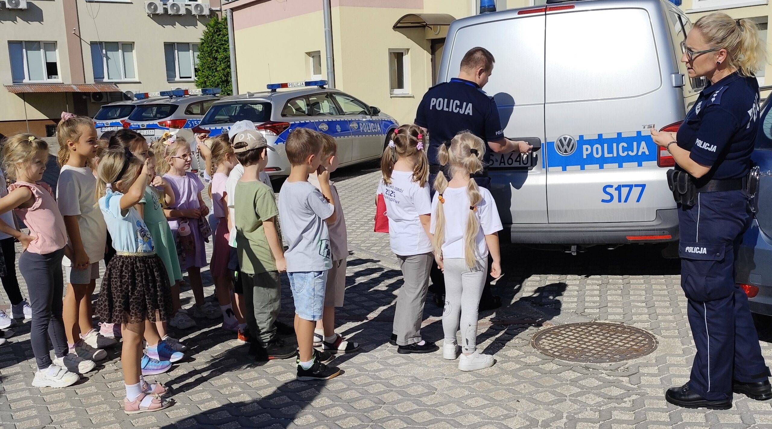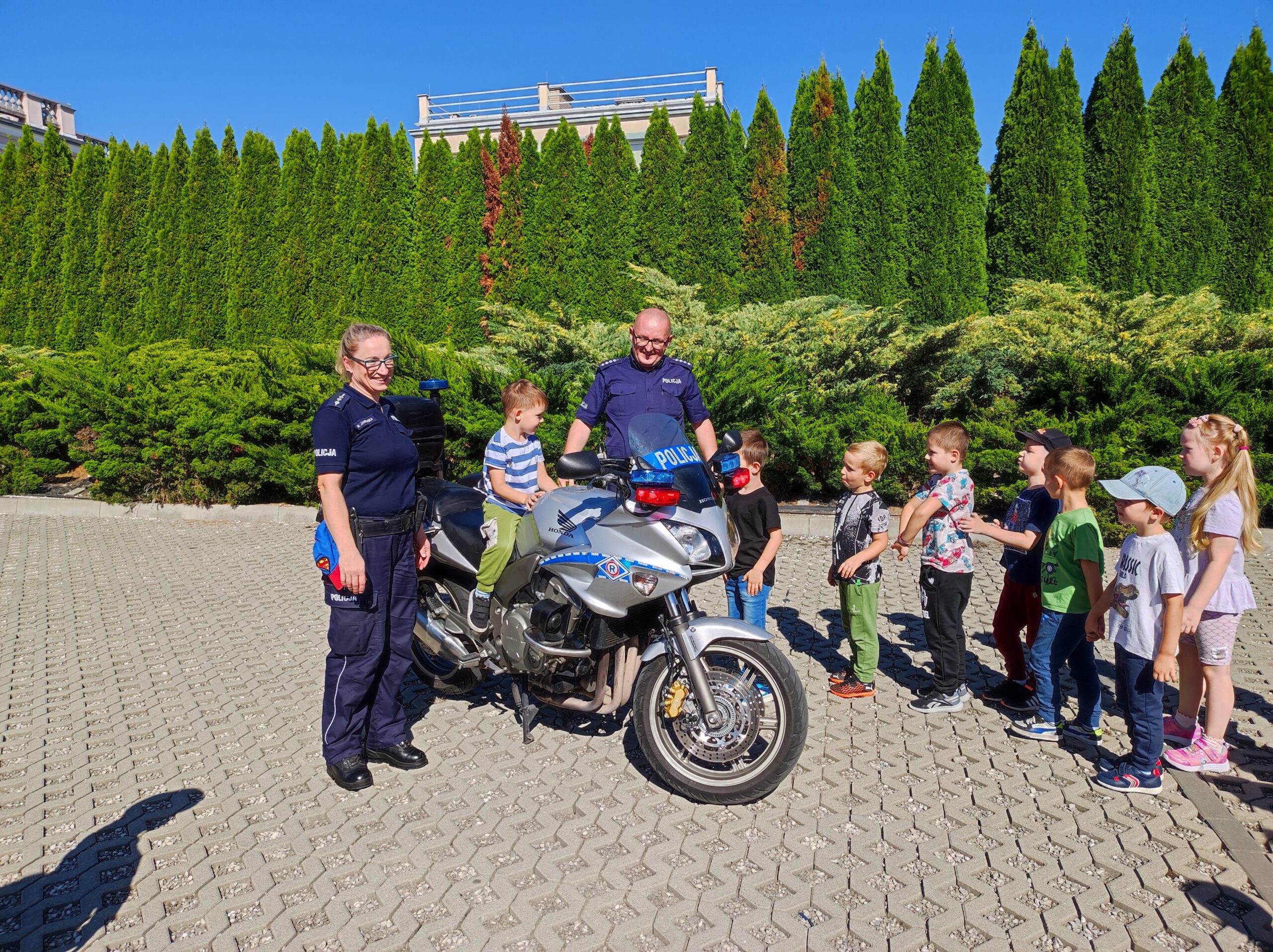 Na początku przedszkolaki zobaczyły stanowisko kierowania i dowiedziały się na czym polega praca policjantów pełniących tam służbę. Kolejnym miejscem był parking przed komendą i stojące na nim policyjne pojazdy. Każdy mógł wejść do samochodu policyjnego, usłyszeć i zobaczyć sygnały dźwiękowe i świetlne. Duże zainteresowanie wśród dzieci wzbudziły również policyjne motory. Z ogromnym zaciekawieniem słuchały opowiadań policjantów, dzięki którym zapoznały się ze specyfiką służby policjantów ruchu drogowego i prewencji. Dzieci zostały zaproszone również do gabinetu Komendanta Policji, który serdecznie ich powitał i poczęstował cukierkami. Pełni wrażeń, bogatsi o nową wiedzę wróciły do przedszkola.