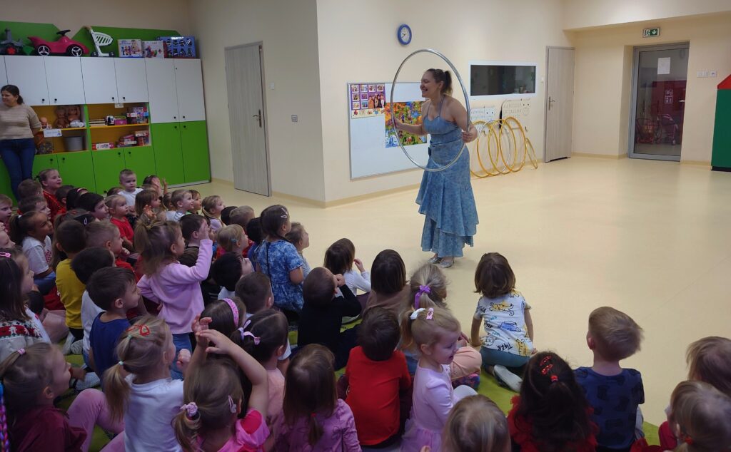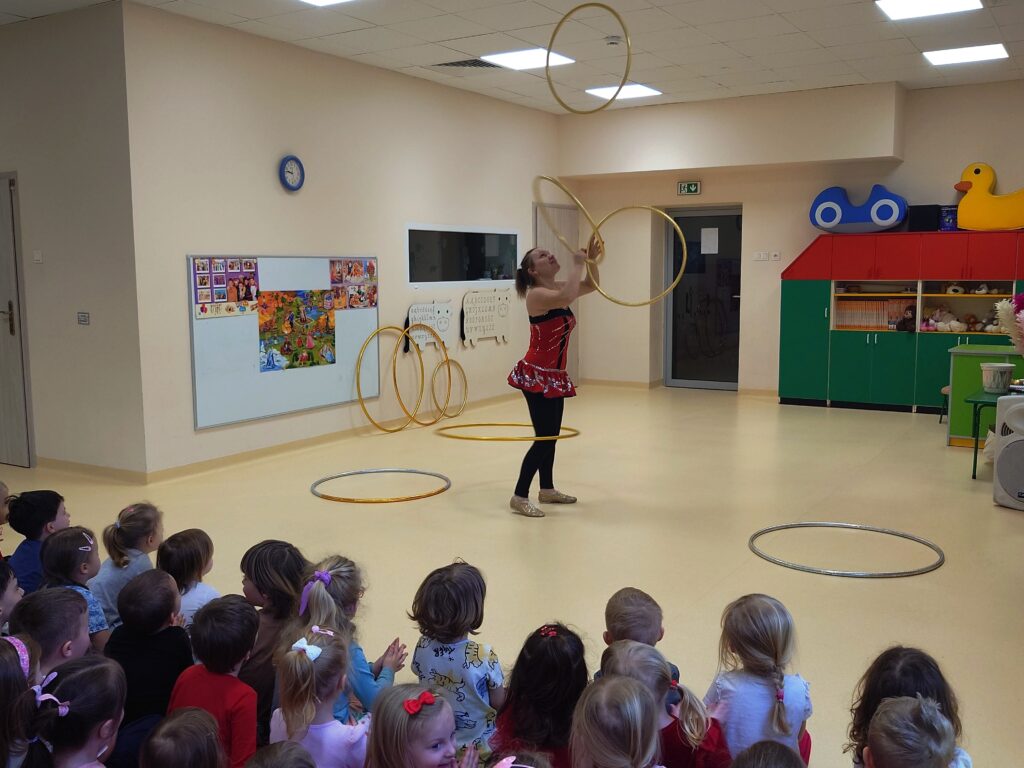 13 lutego mieliśmy okazję gościć w naszym przedszkolu cyrk Kaskada. W sali przedszkolnej zapanowała magiczna atmosfera. Artystka cyrkowa Natalia przedstawiła wiele akrobacji cyrkowych – żonglerkę różnymi przedmiotami, kręcenie hula hop oraz magiczne sztuczki. Chętne przedszkolaki mogły spróbować swych talentów cyrkowych włączając się czynnie do zabawy, co wzbudziło radość wszystkich uczestników. Wspaniały występ cyrkowy dostarczył zebranym mnóstwo miłych wrażeń i przeżyć, bo jak wiadomo wszystkim „śmiech to zdrowie”. Uczestnicy gromkimi brawami podziękowali artystce za wspaniałe widowisko.