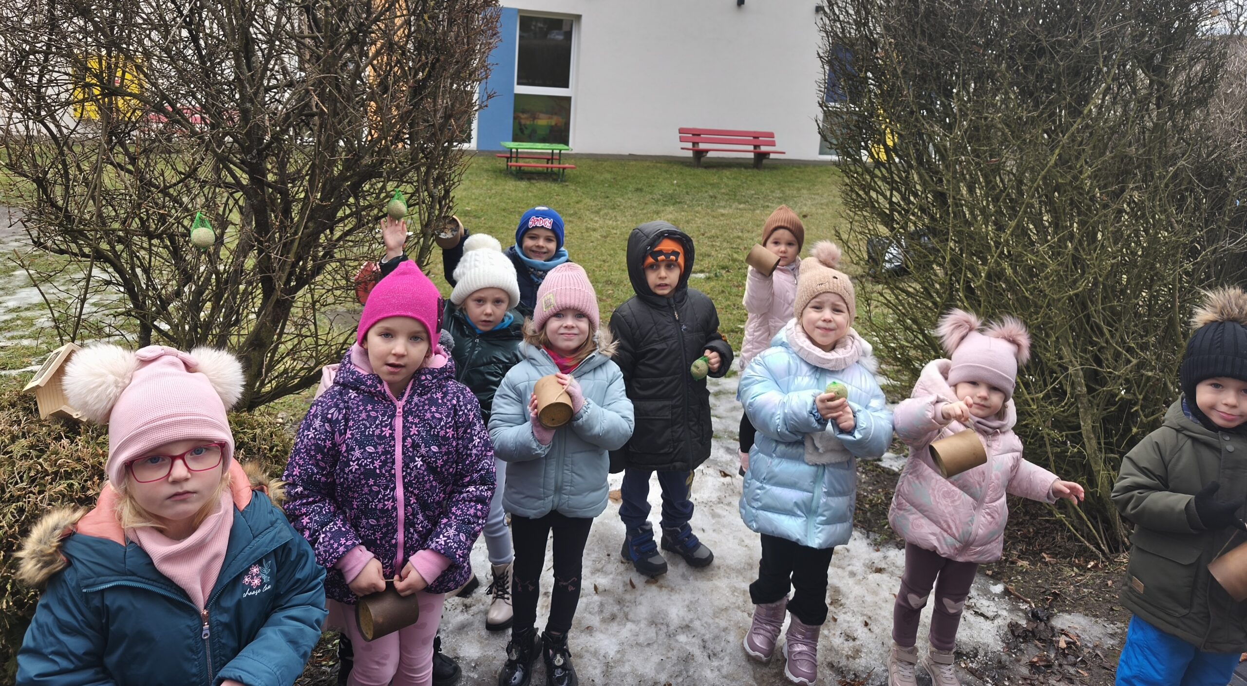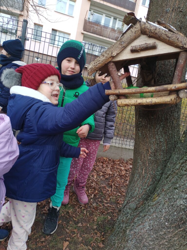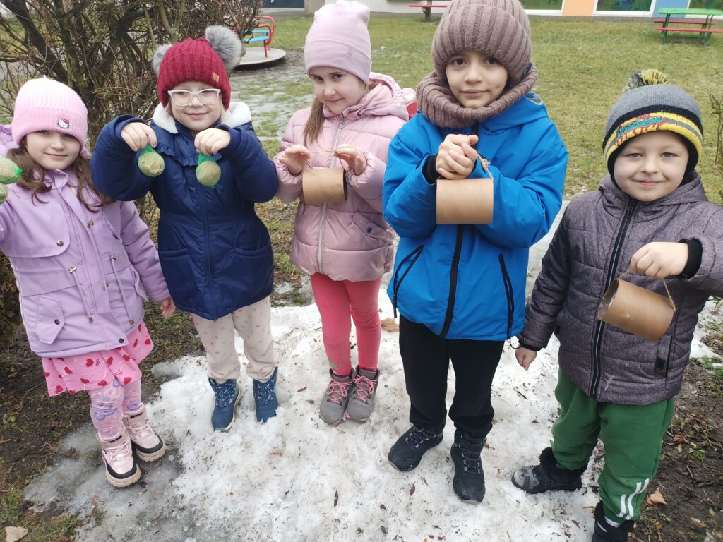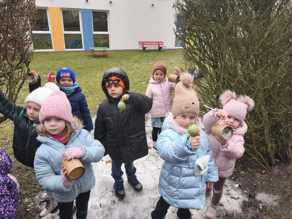 Przedszkolaki wiedzą, że w okresie zimowym ptakom trudno znaleźć pożywienie dlatego postanowiły zadbać, aby skrzydlaci przyjaciele mieli co jeść. Dzieci z grypy Sasanki i Stokrotki wybrały się do przedszkolnego ogrodu, aby tam uzupełnić ziarno w karmniku i zawiesić tłuszczowe kule z ziarnami.