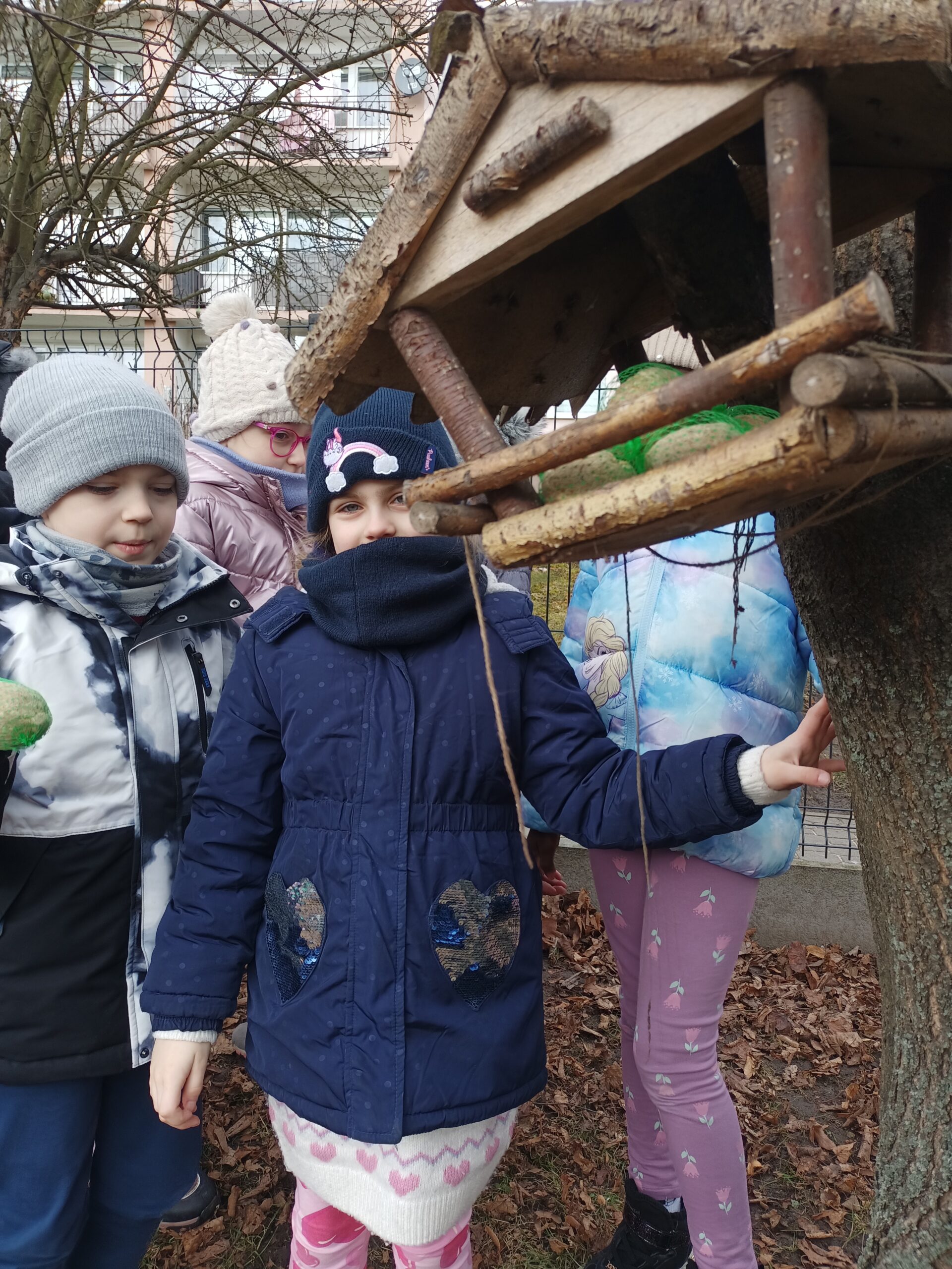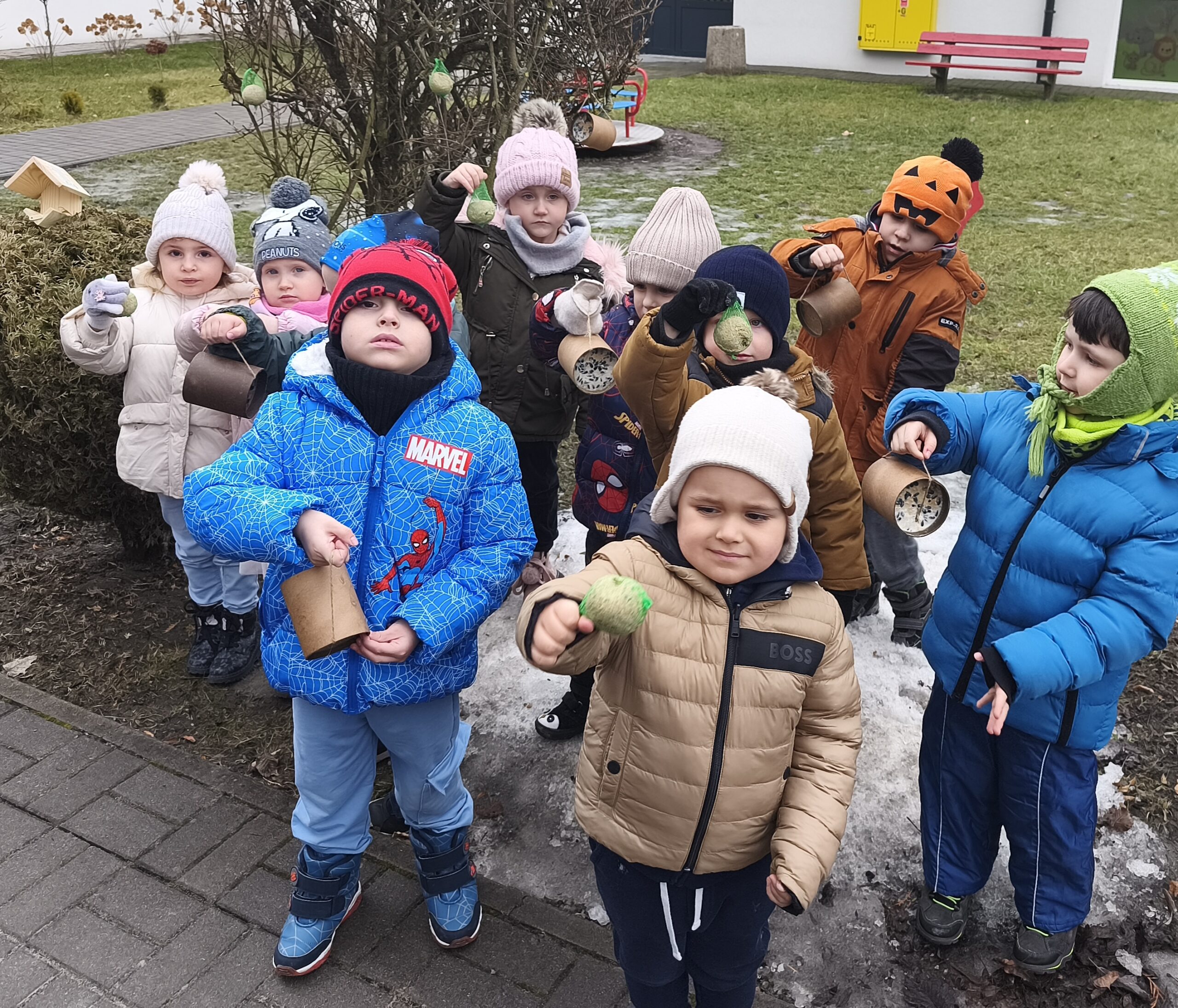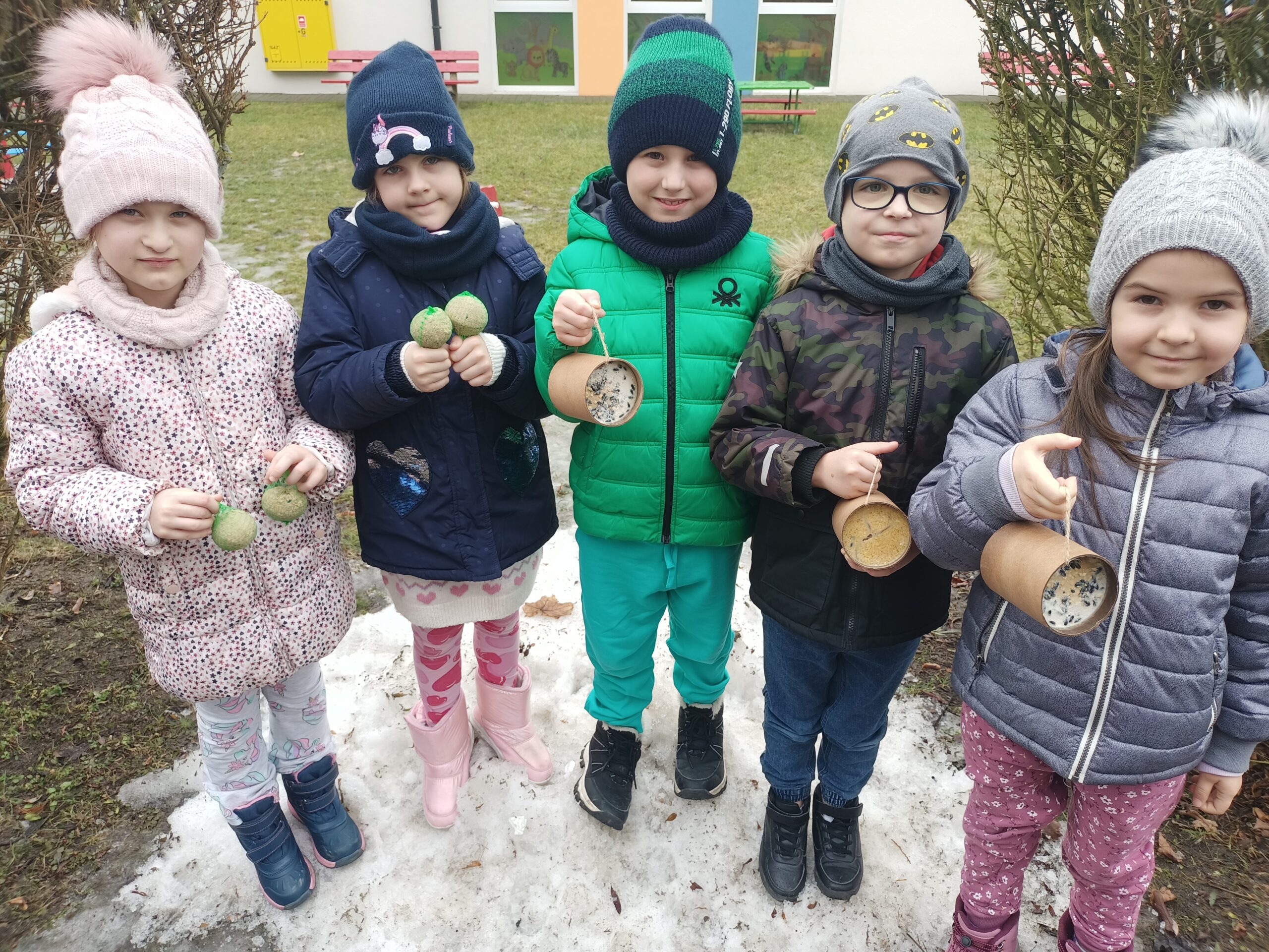 Przedszkolaki wiedzą, że w okresie zimowym ptakom trudno znaleźć pożywienie dlatego postanowiły zadbać, aby skrzydlaci przyjaciele mieli co jeść. Dzieci z grypy Sasanki i Stokrotki wybrały się do przedszkolnego ogrodu, aby tam uzupełnić ziarno w karmniku i zawiesić tłuszczowe kule z ziarnami.