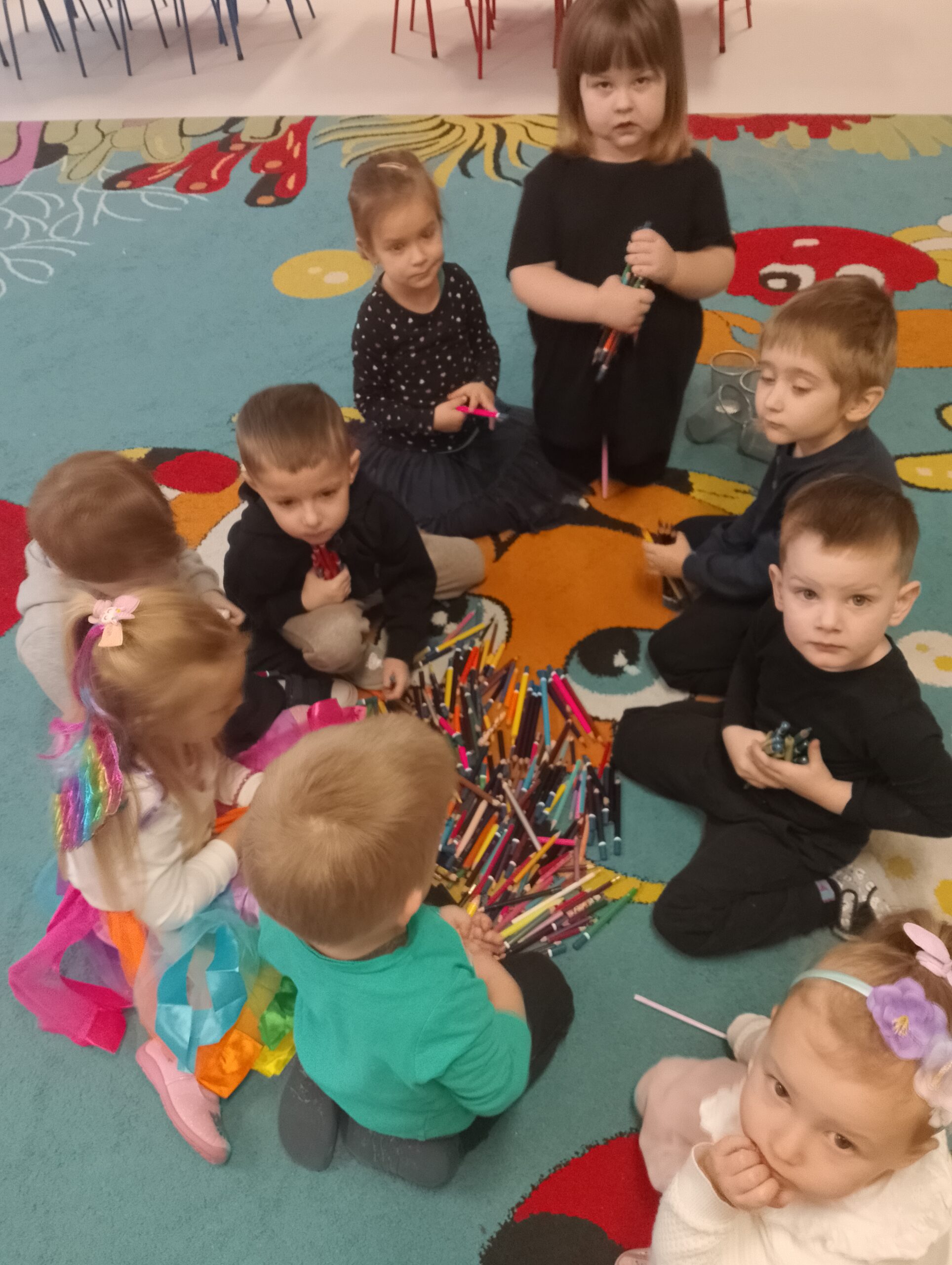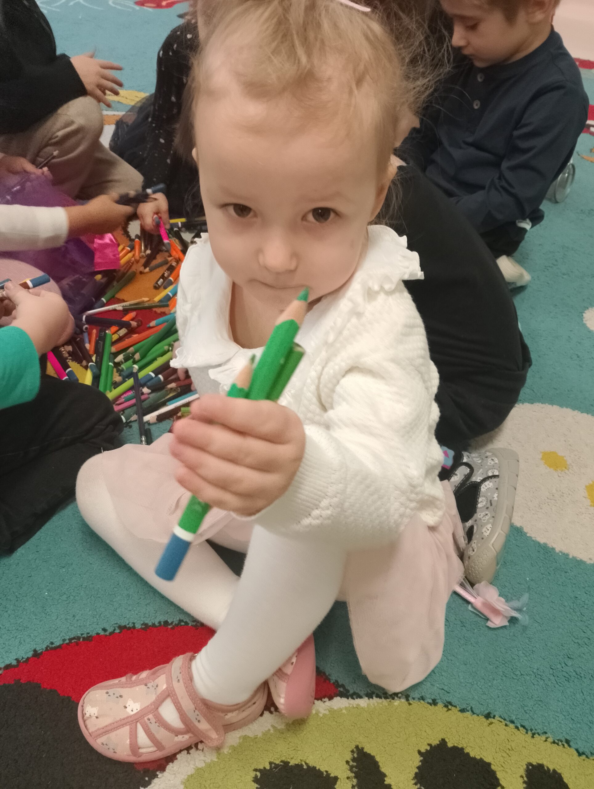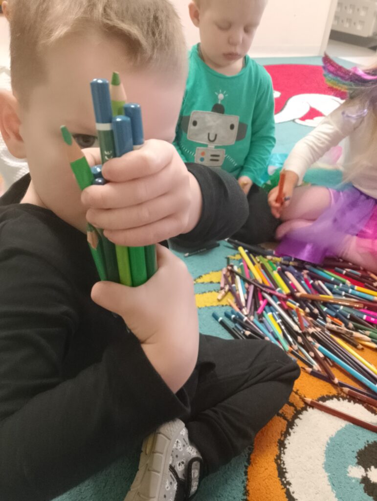 W czasie zajęć dzieci dowiedziały się również, skąd biorą się kredki i jak powstają. Rozmawiały o tym, dlaczego warto dbać o swoje przybory plastyczne, oraz w jaki sposób dzięki kredkom można wyrażać emocje. Nie zabrakło wspólnej zabawy do piosenki „Kolorowe Kredki”