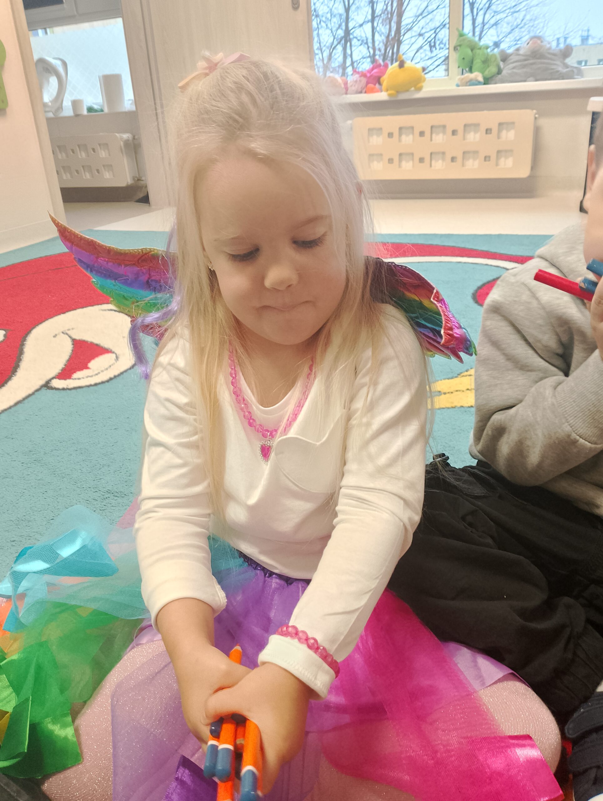 Już od rana w sali panowała radosna, kolorowa atmosfera. Dzieci rozpoczęły świętowanie od zabaw integracyjnych, w których każdy mógł wybrać swoją ulubioną kredkę i zaprezentować jej kolor.