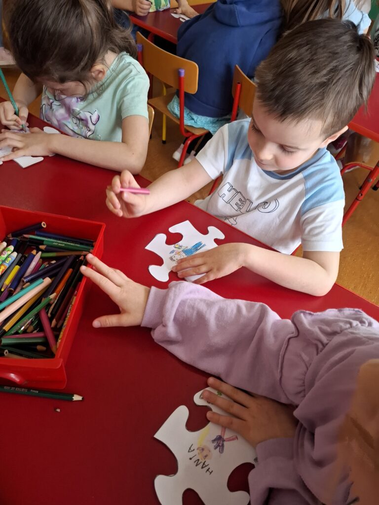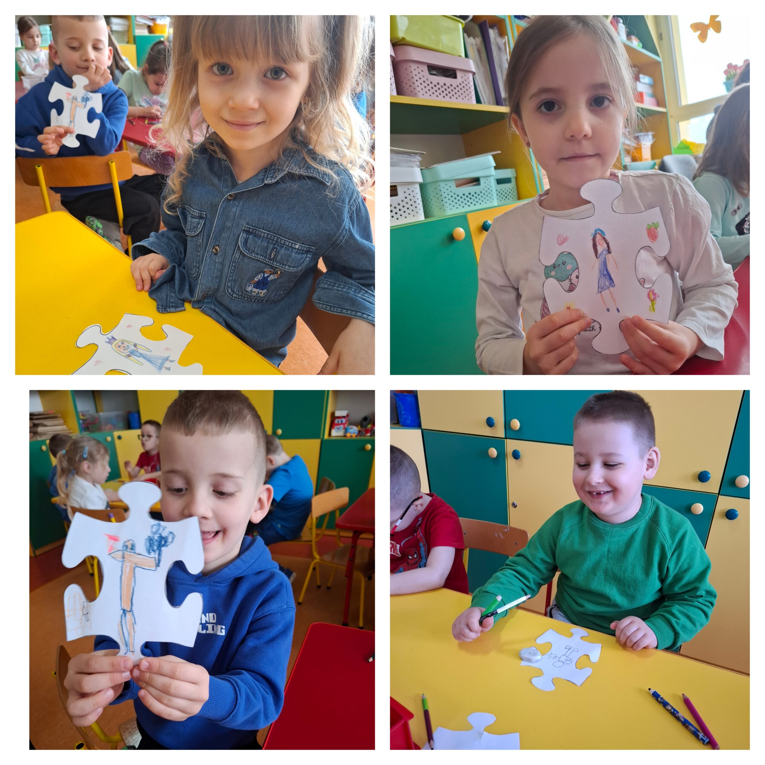 Kolejnym etapem było zadanie plastyczne – każde dziecko otrzymało puzzla, na którym narysowało siebie oraz to, co najbardziej lubi robić. Puzzle przedszkolaków symbolizują fakt, iż mimo różnic tworzymy wspólnotę i każdy z nas jest jej ważną częścią.