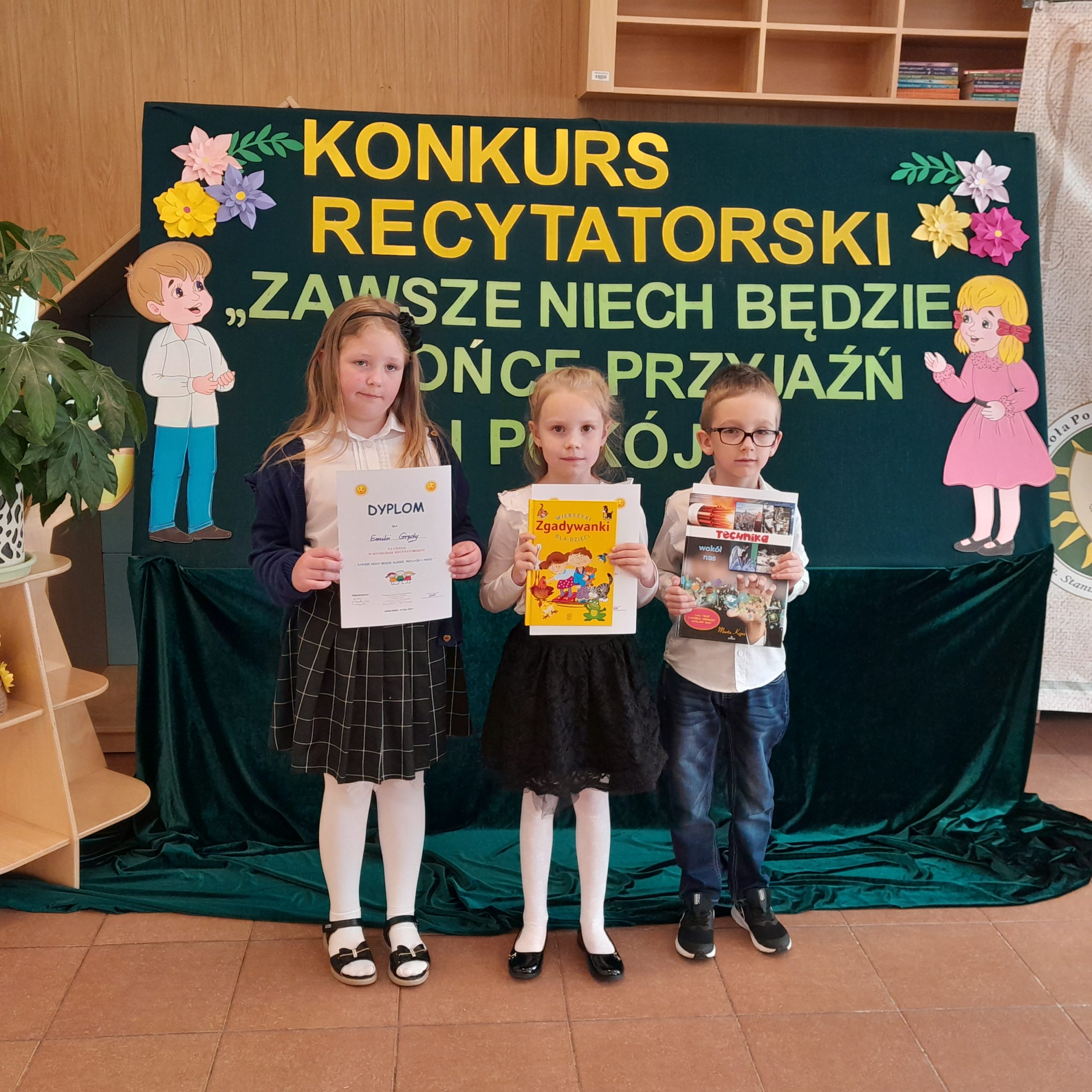 Udział dzieci z grupy IV i V w II etapie – gminnym, Konkursu Recytatorskiego pod hasłem „Zawsze niech będzie słońce, przyjaźń i pokój”.