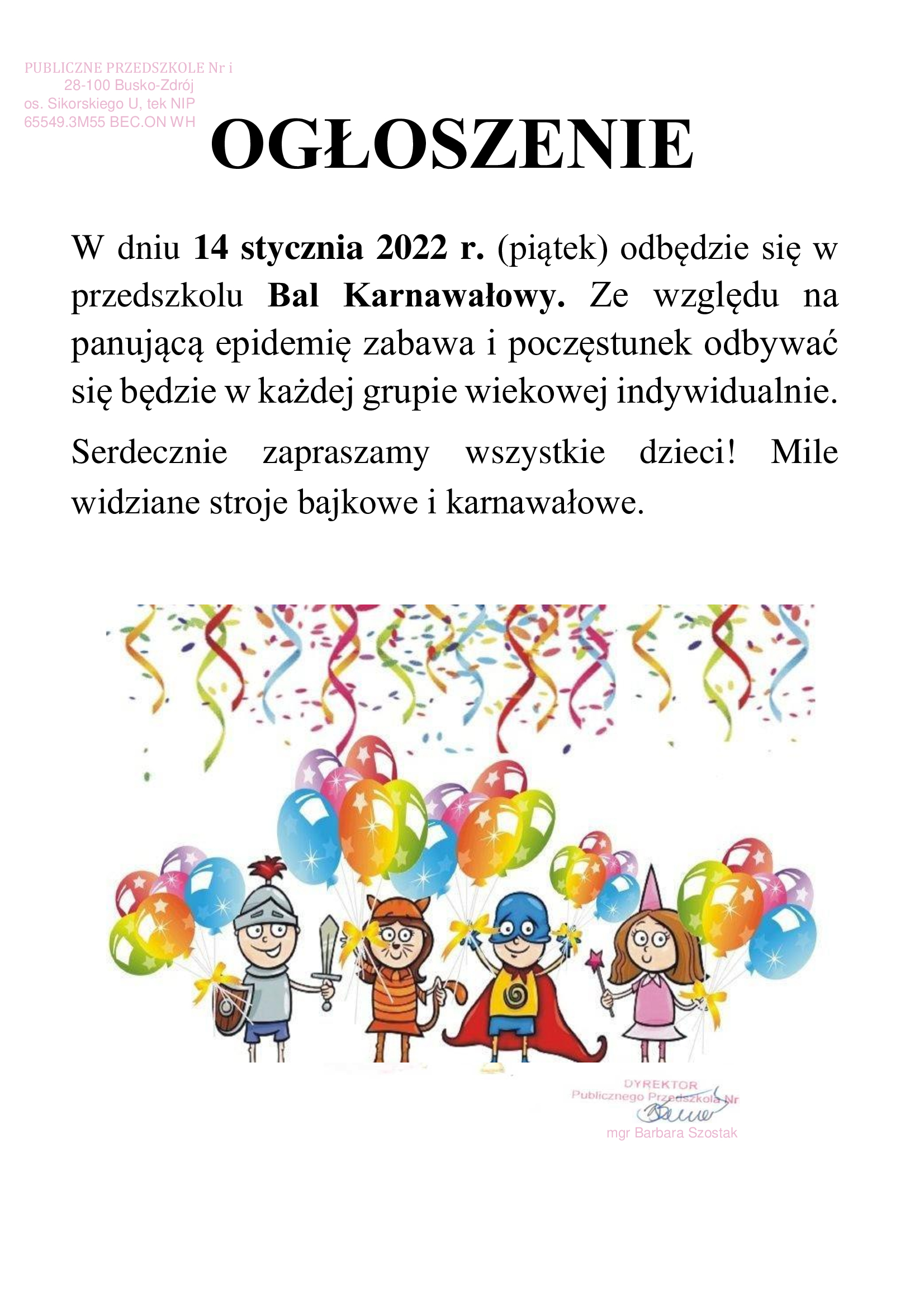 Ogłoszenie – bal karnawałowy 2022