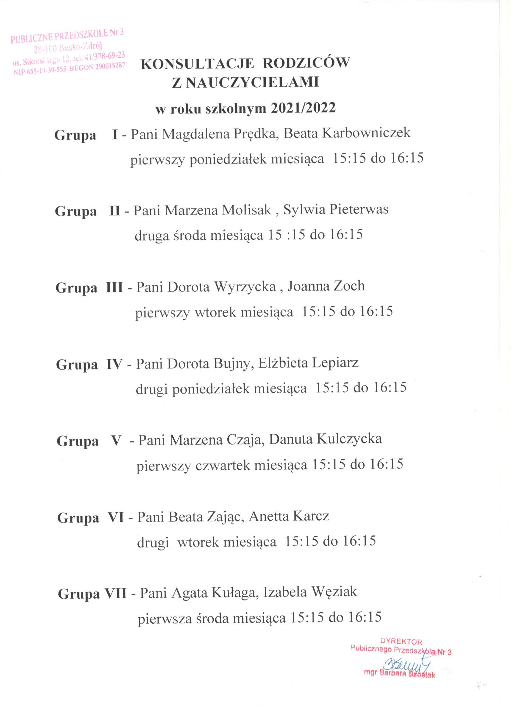 Harmonogram konsultacji rodziców z nauczycielami na rok szkolny 2021/2022