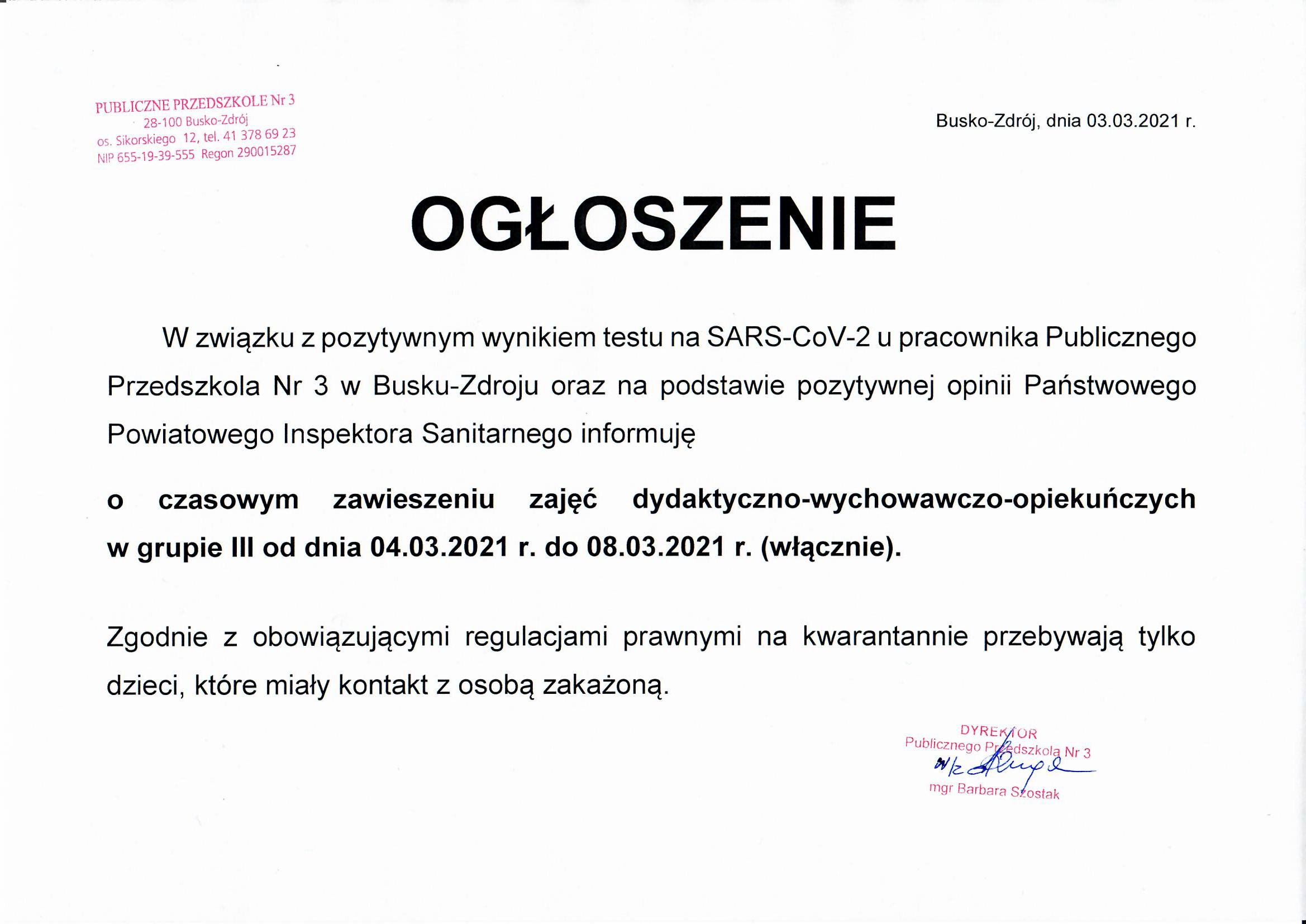 Ogłoszenie dotyczące zawieszenia zajęć w grupie III