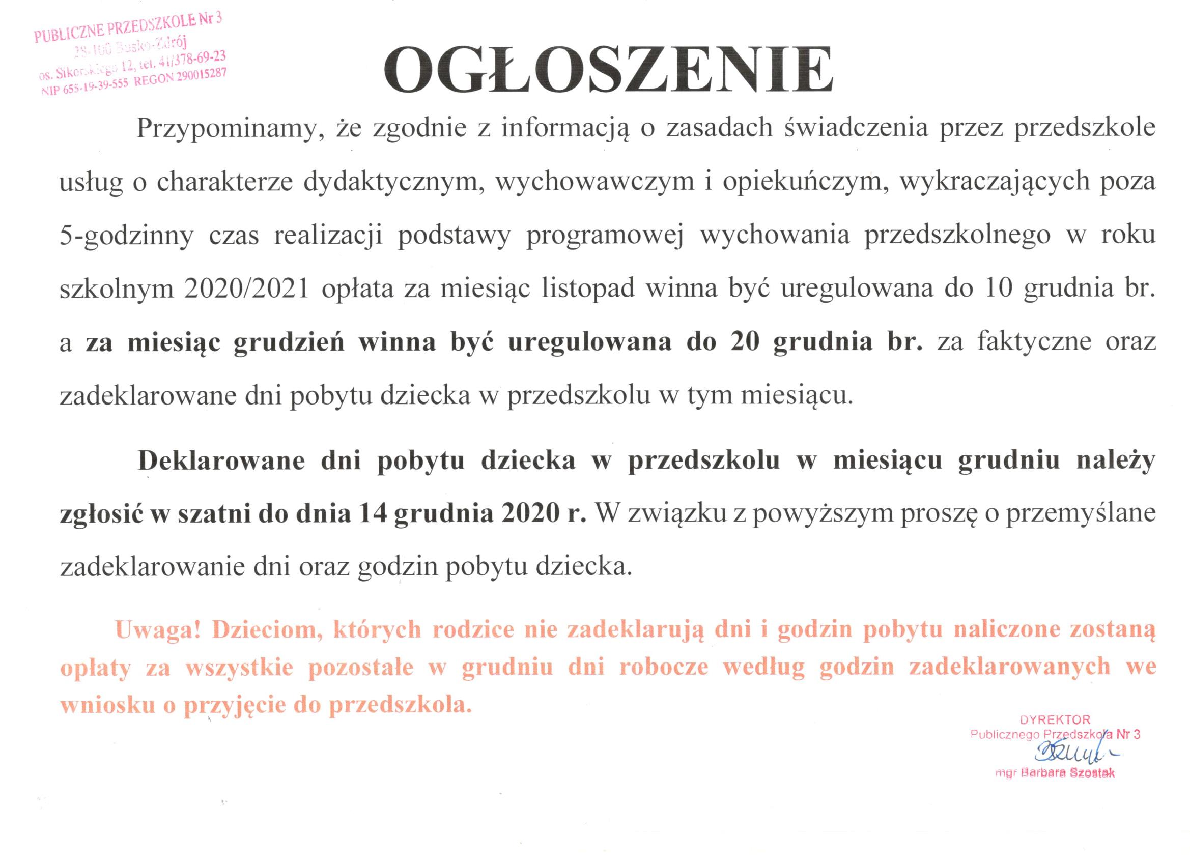 Ogłoszenie w sprawie płatności za grudzień 2020 roku