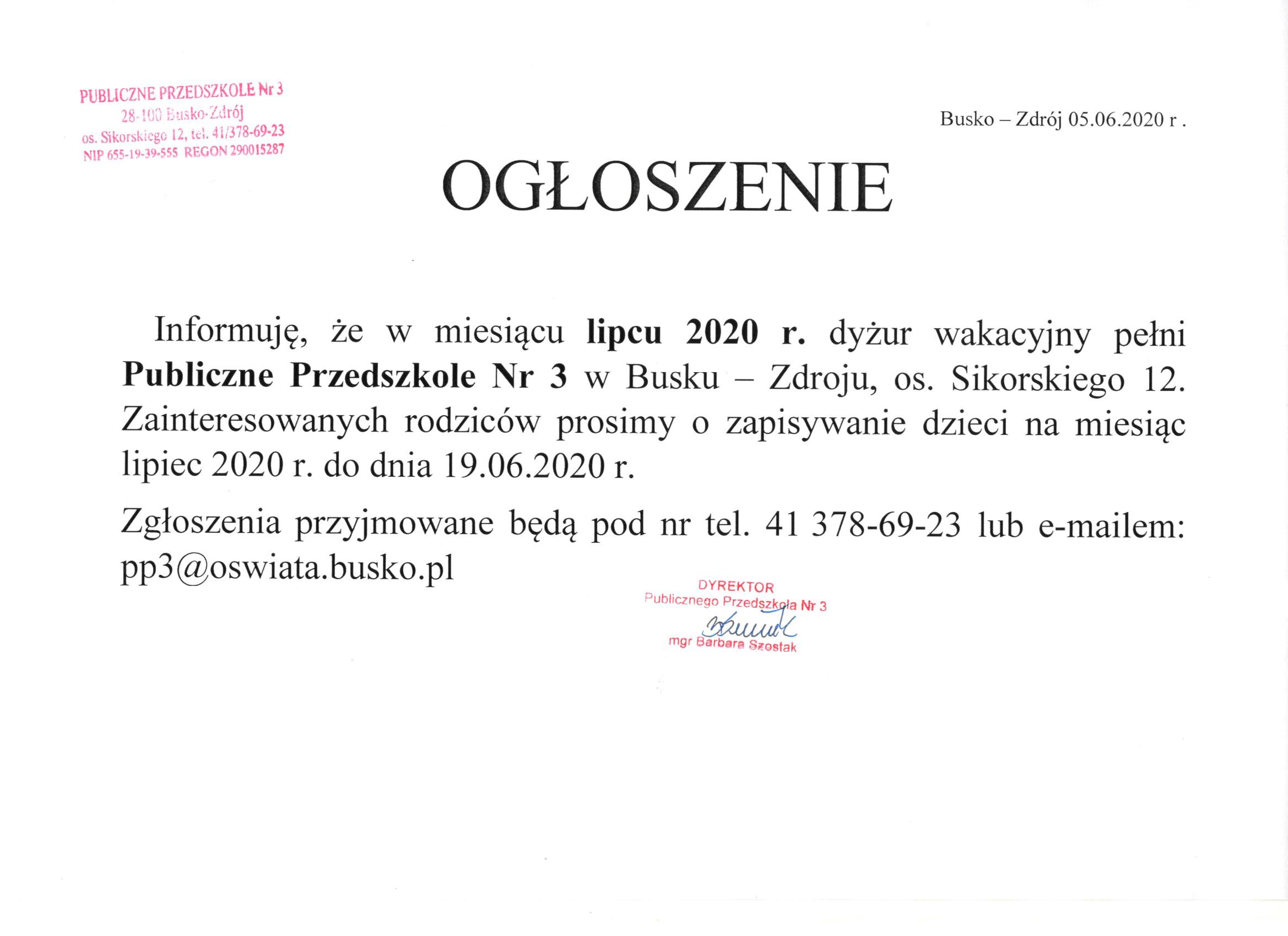 Ogłoszenie dotyczące dyżuru wakacyjnego