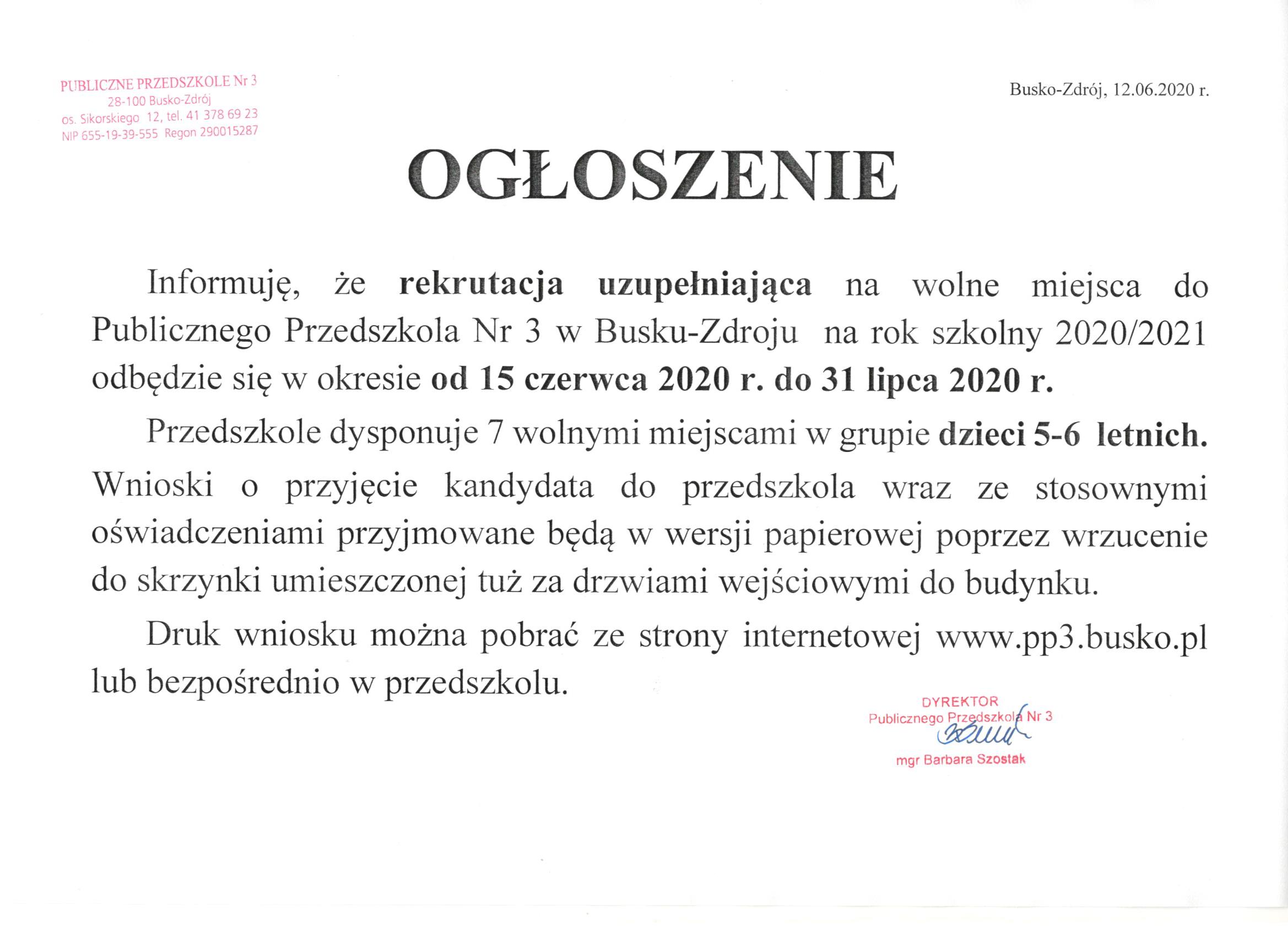 Rekrutacja uzupełniająca na rok szkolny 2020/2021