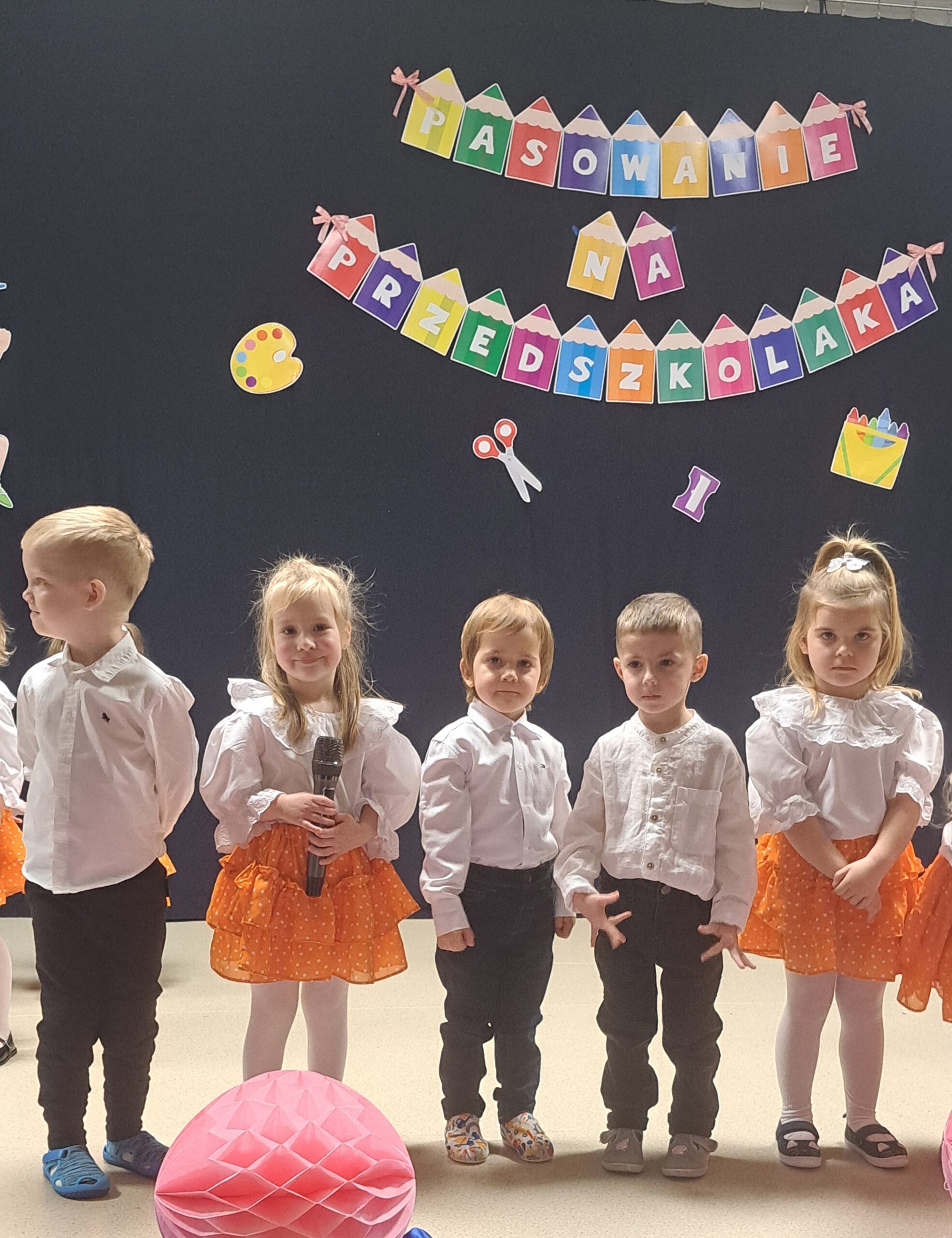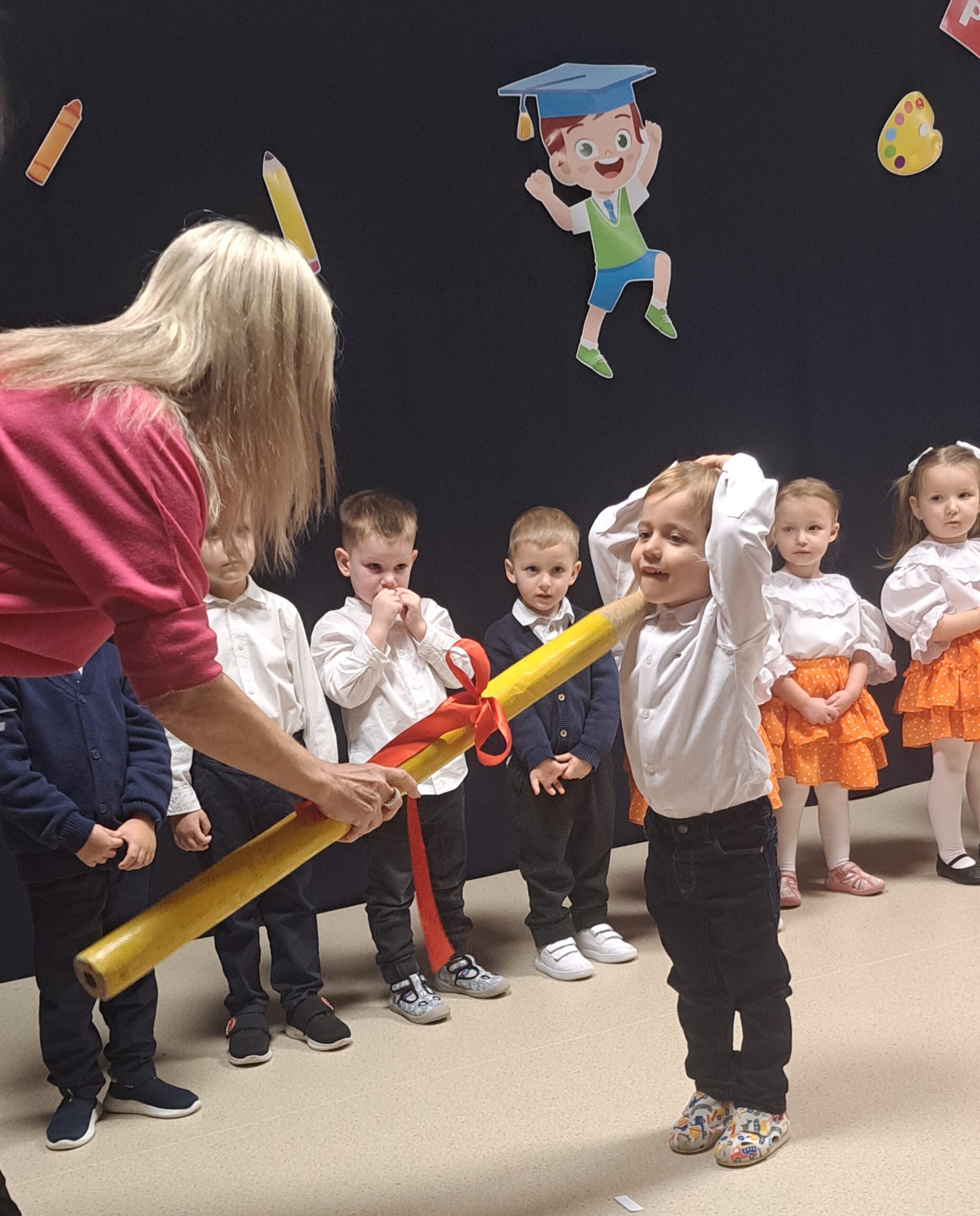 Najważniejszym punktem spotkania było oczywiście symboliczne pasowanie. Każde dziecko podchodziło do Pani Dyrektor, która dużą, kolorową kredką dokonywała aktu pasowania, wypowiadając słowa: „Pasuję Cię na przedszkolaka!”. Po oficjalnej części wszystkie dzieci otrzymały pamiątkowe dyplomy oraz drobne upominki, które będą przypominać im o tym niezwykłym dniu.