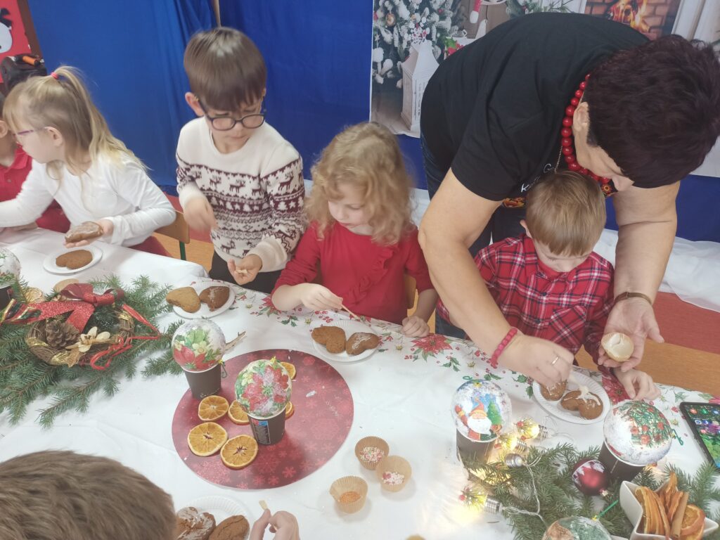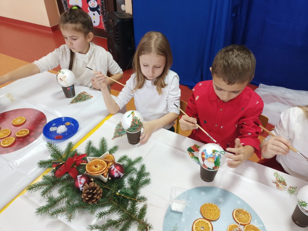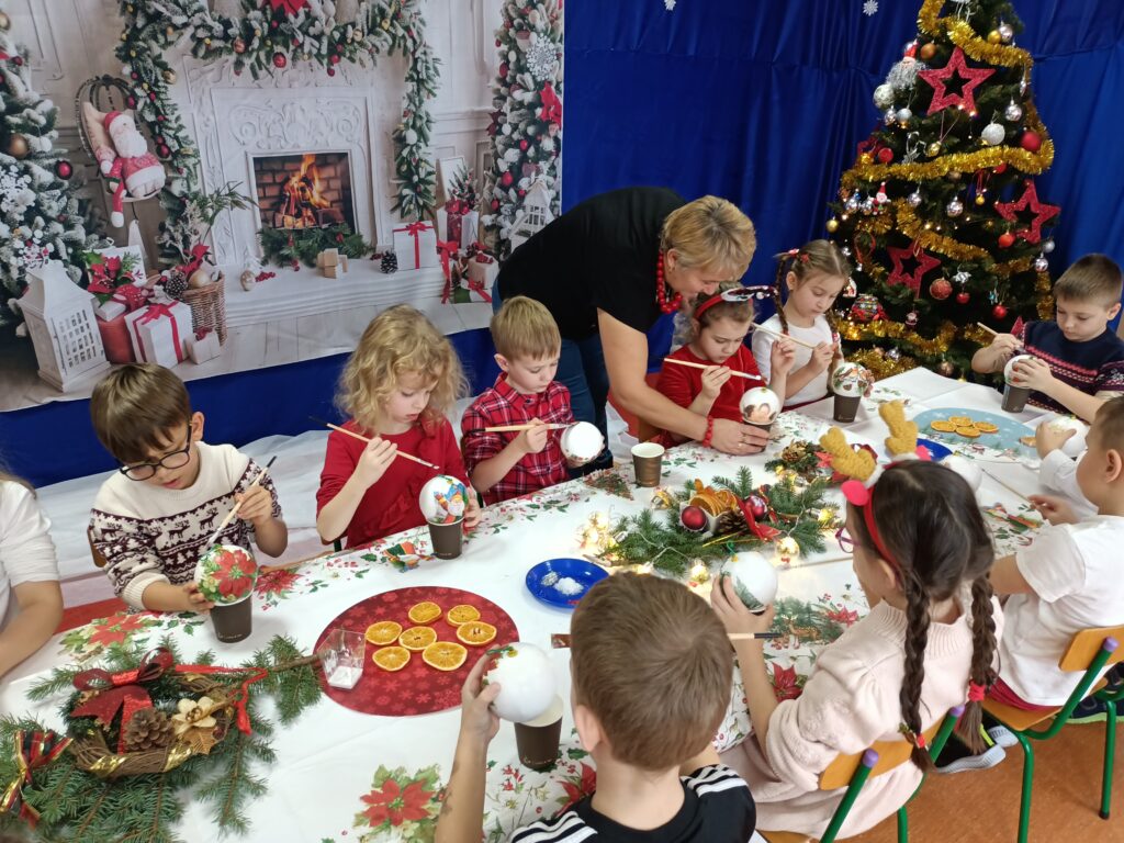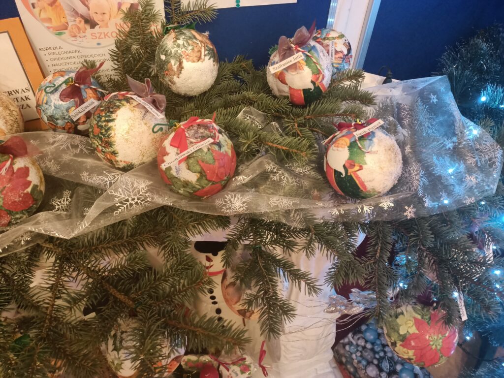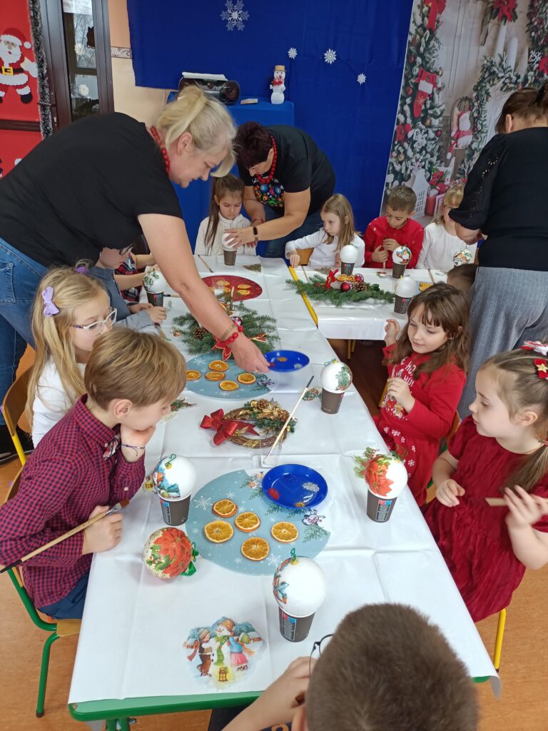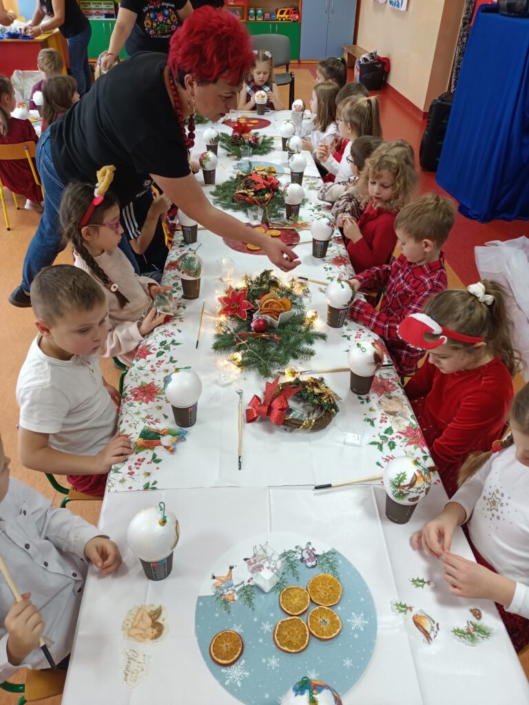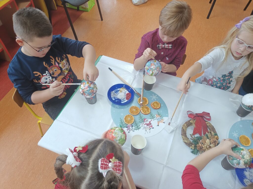 Efektem pracy były robione z dziećmi bombki formą decoupage, które mają zdobić choinki dzieci.
