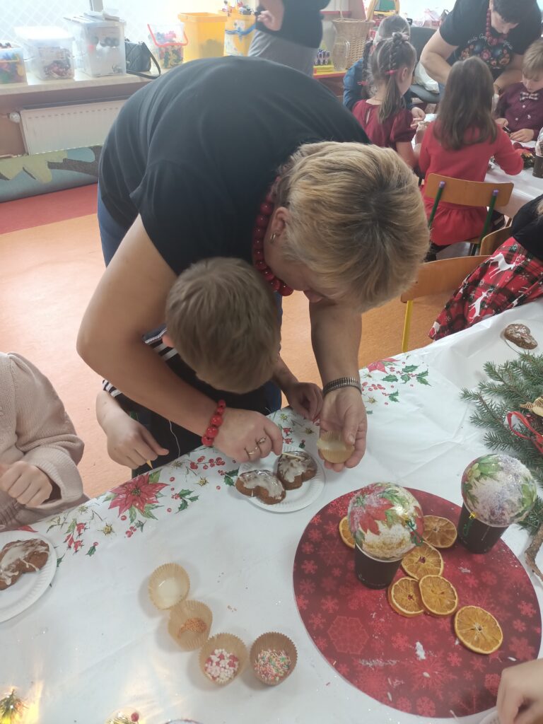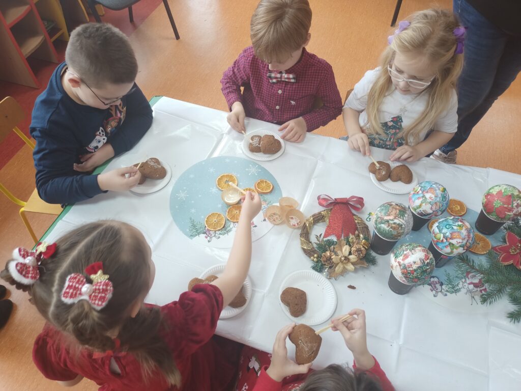 Przedszkolaki także własnoręcznie zdobiły pieczone pierniki. Dzieci pełne wrażeń podziękowały Paniom piosenkami świątecznymi i wierszykami. Na koniec Panie obdarowały dzieci upominkami mikołajkowymi.