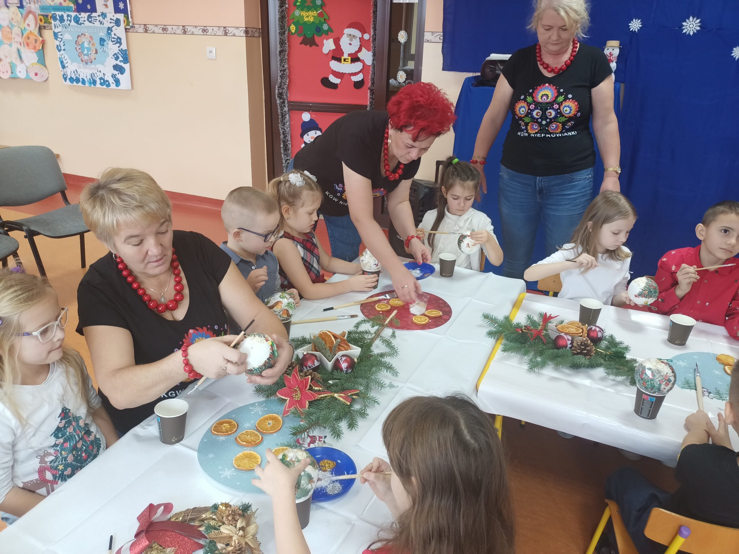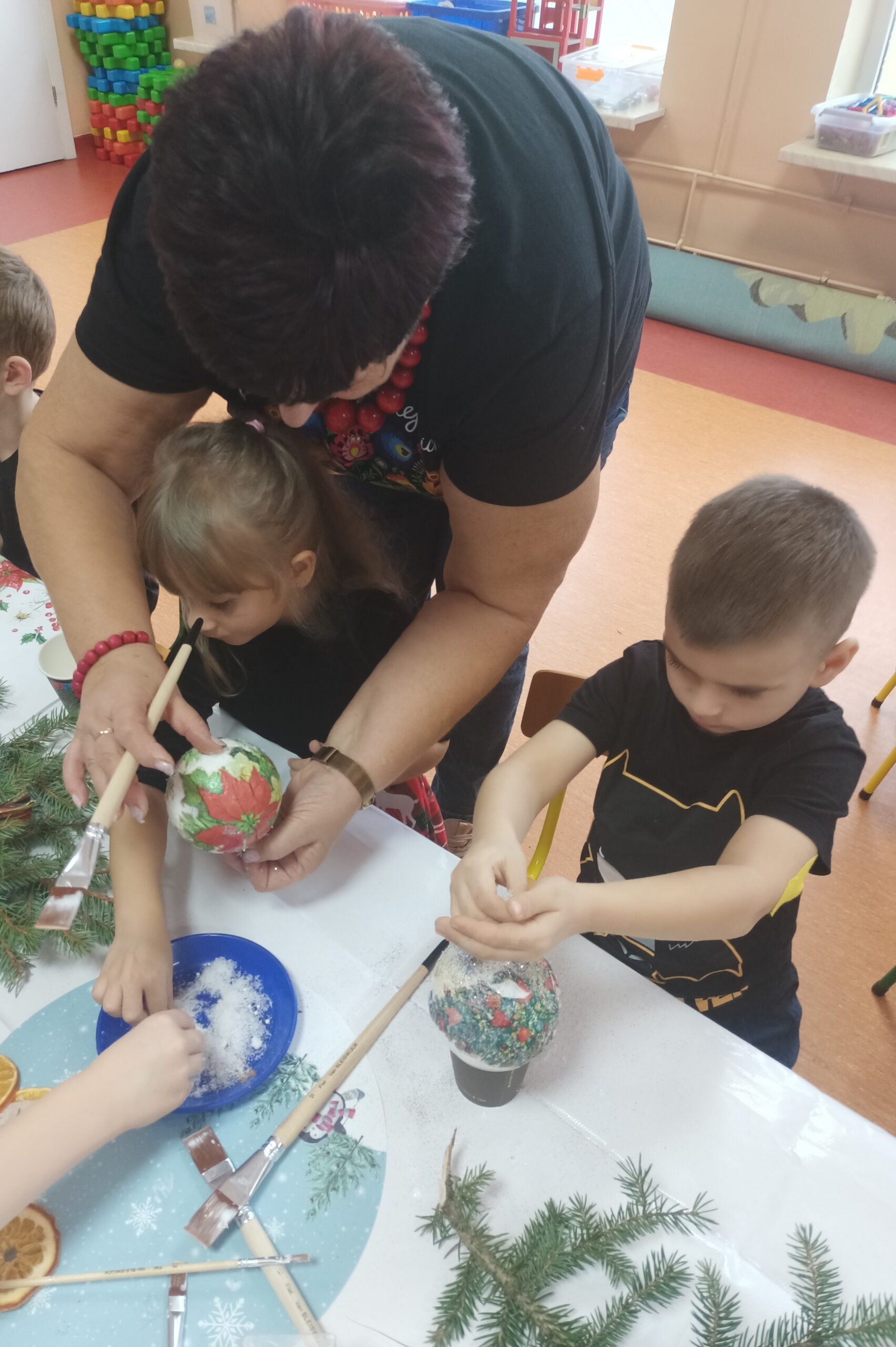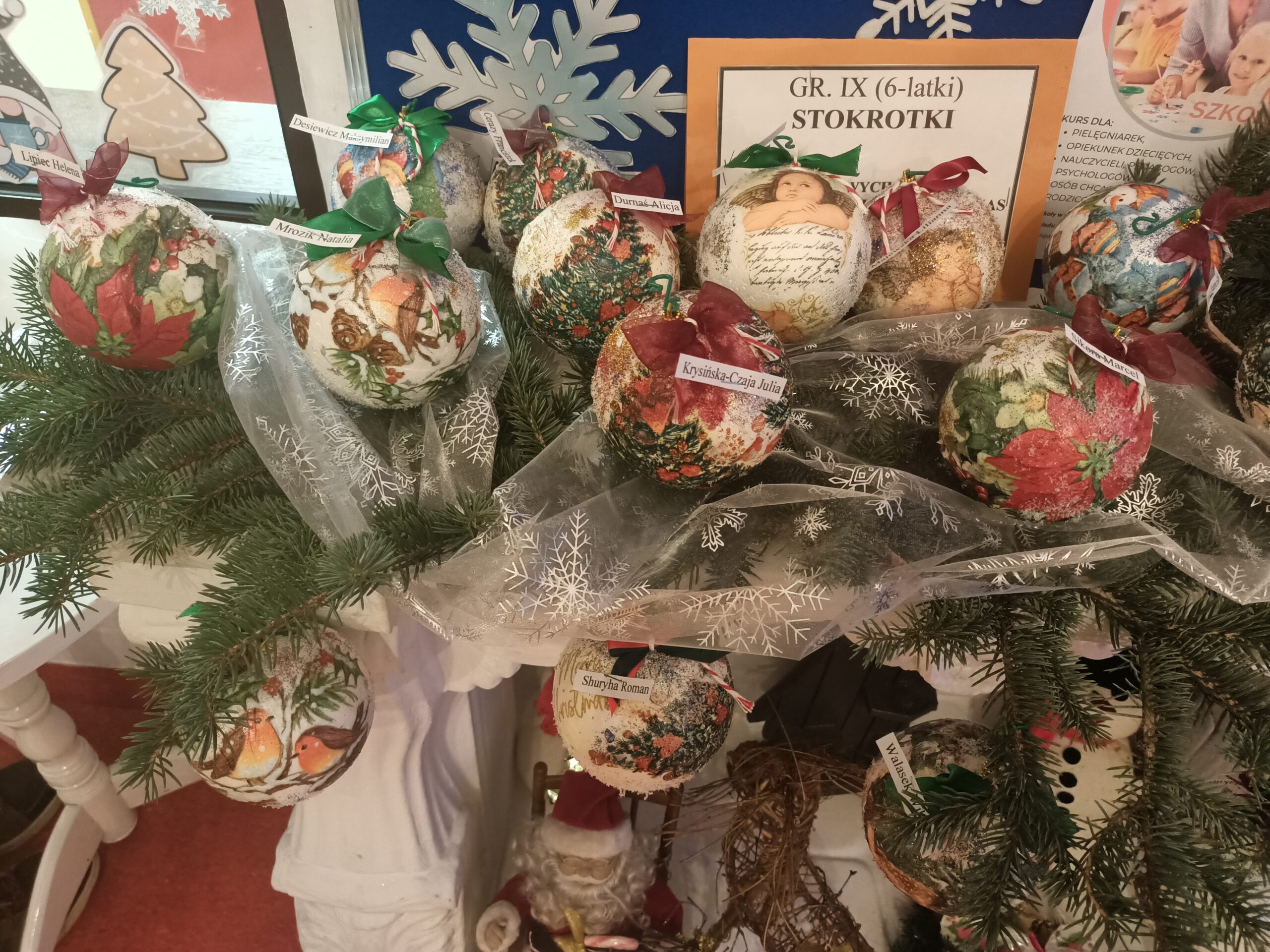 Efektem pracy były robione z dziećmi bombki formą decoupage, które mają zdobić choinki dzieci.