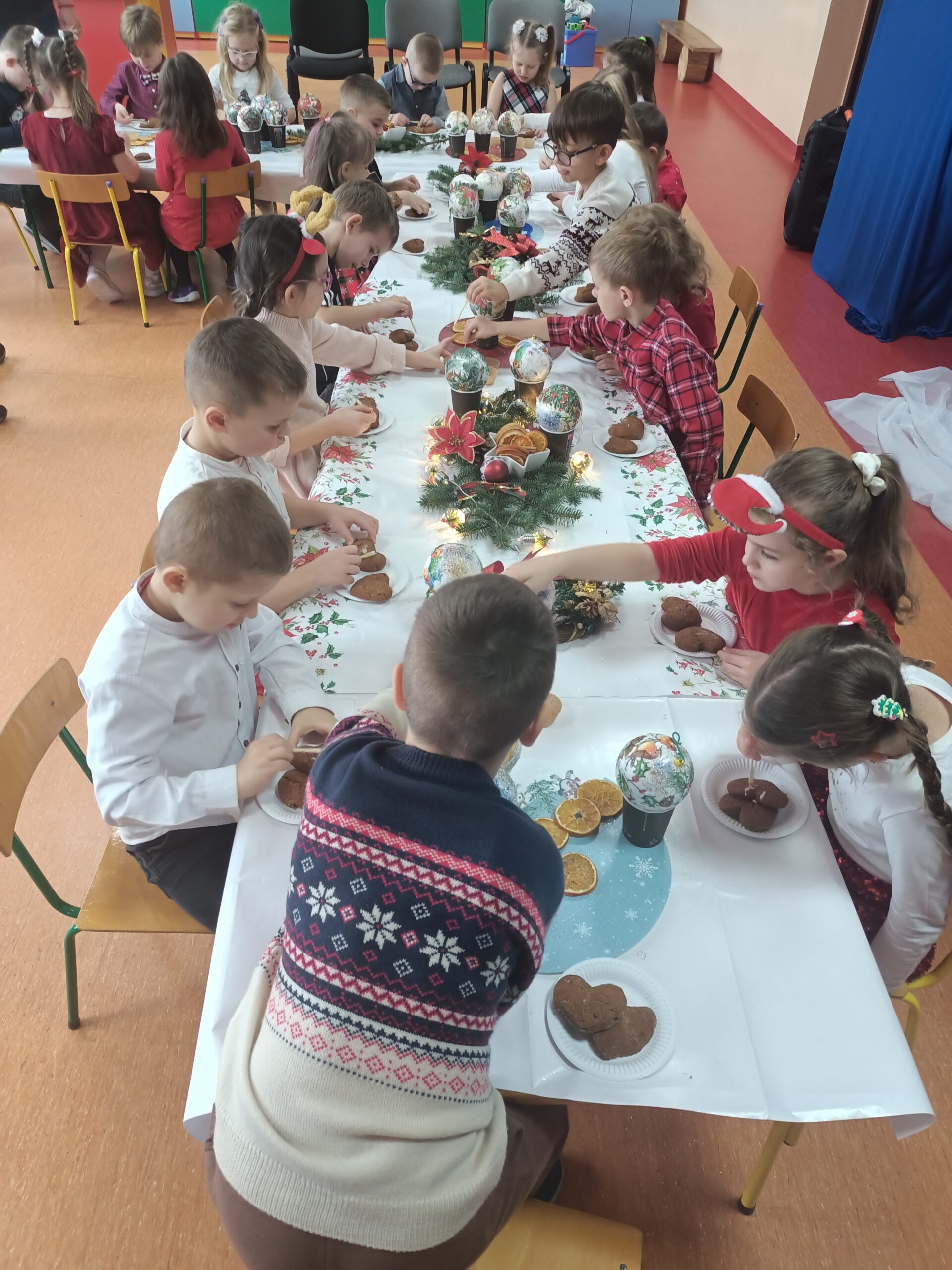 Przedszkolaki także własnoręcznie zdobiły pieczone pierniki. Dzieci pełne wrażeń podziękowały Paniom piosenkami świątecznymi i wierszykami. Na koniec Panie obdarowały dzieci upominkami mikołajkowymi.