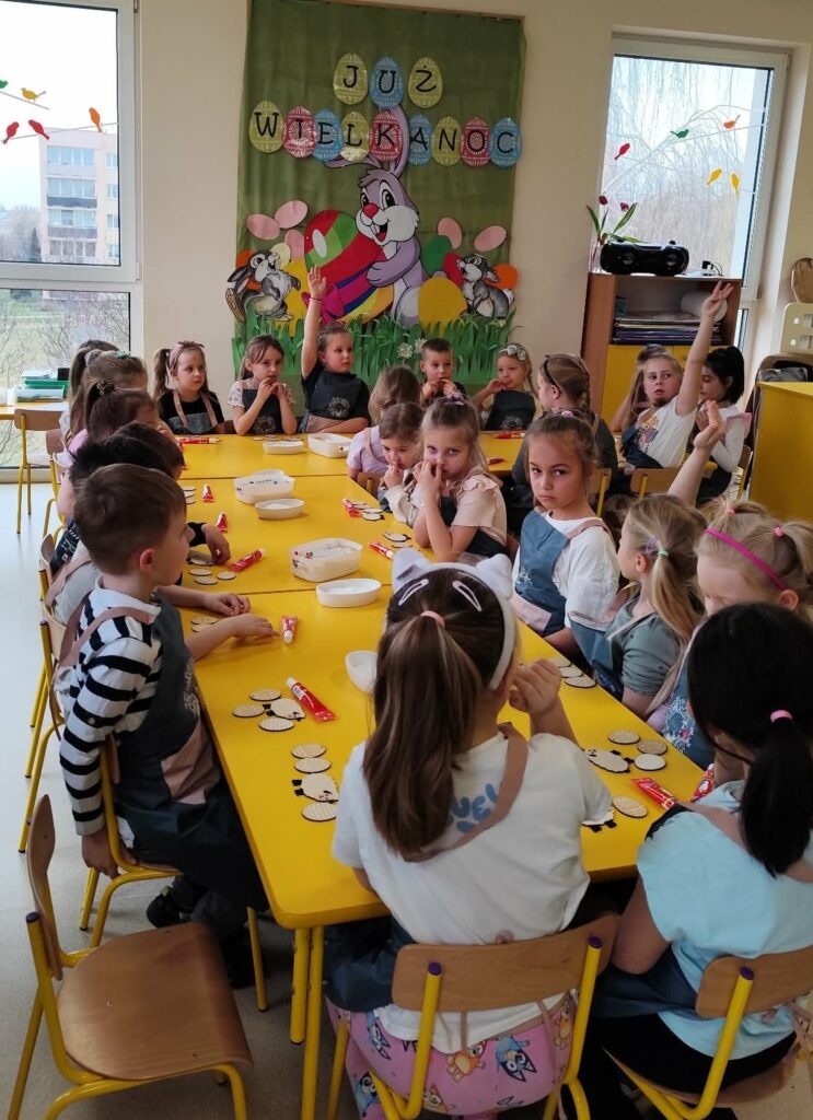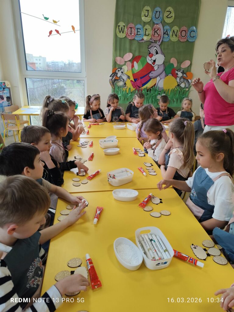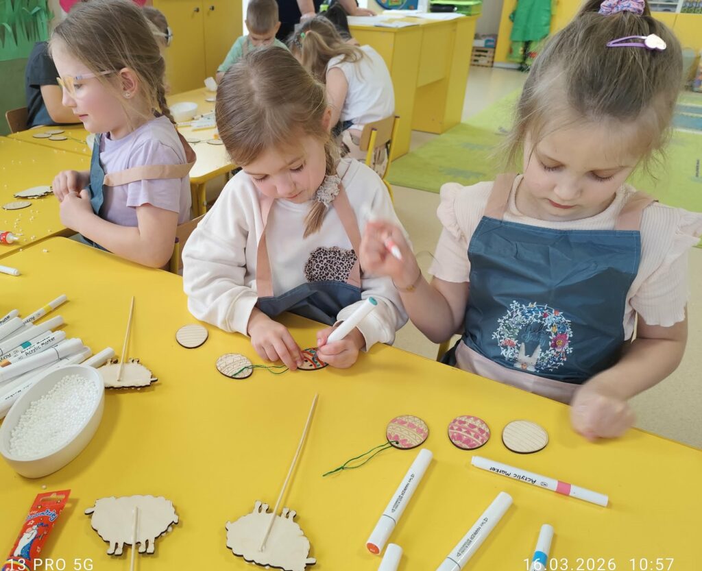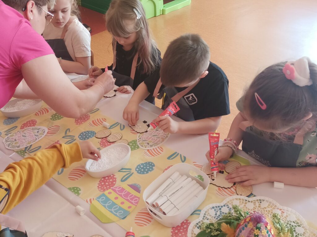 Podczas zajęć dzieci rozwijały swoją kreatywność i zdolności manualne, wykonując własnoręcznie ozdoby wielkanocne do koszyczka za pomocą różnych technik. Przedszkolaki z wielkim zapałem