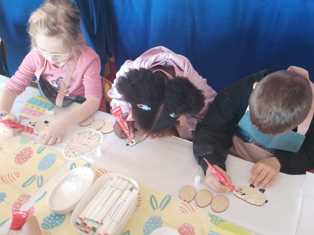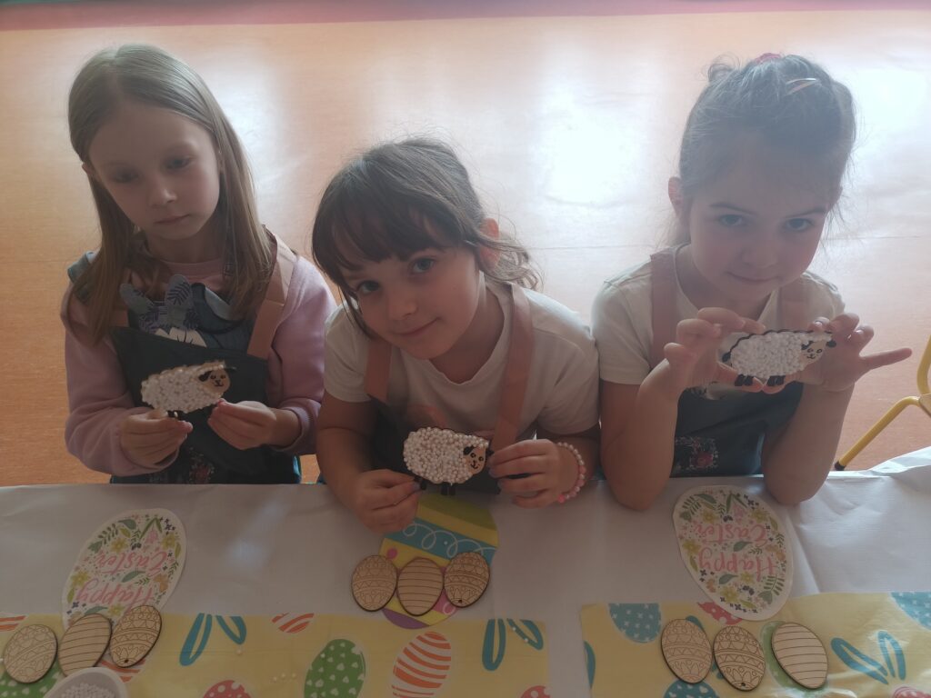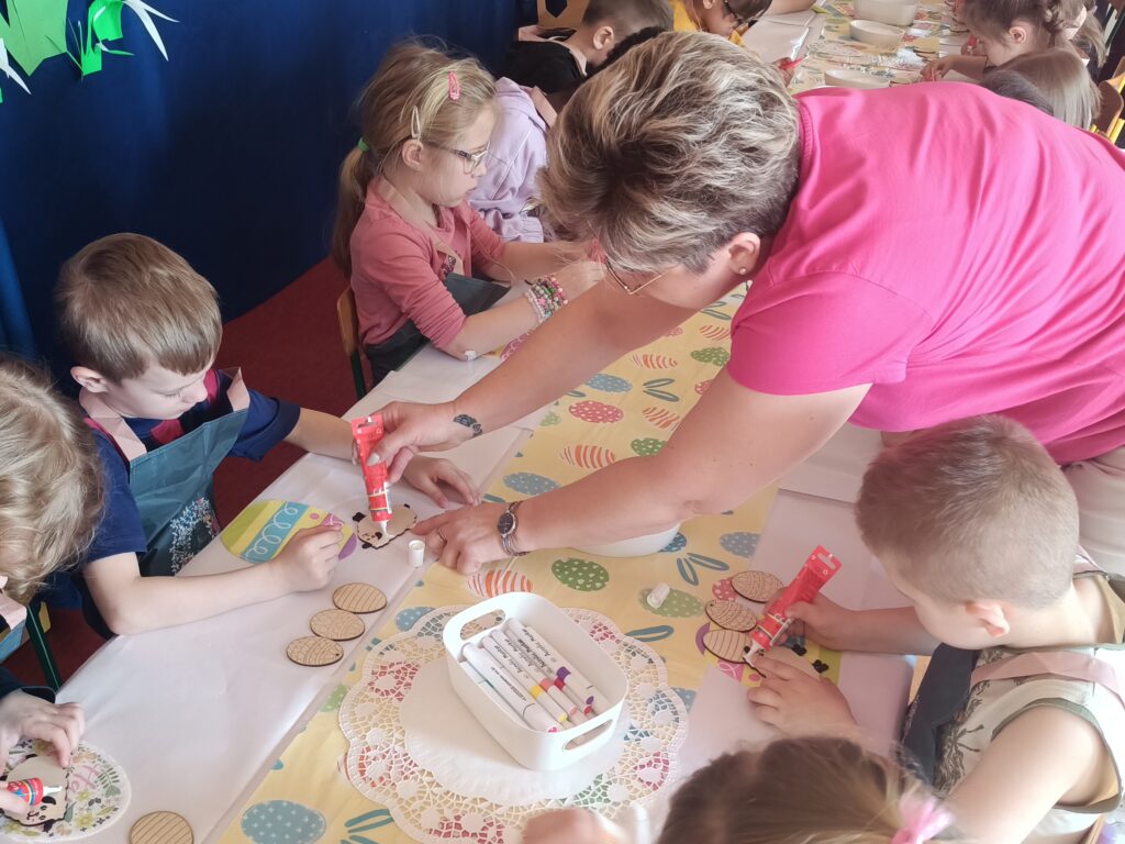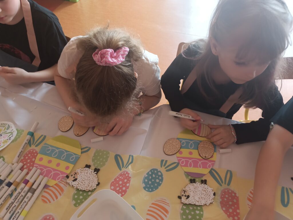 i zaangażowaniem wykonały pisanki i baranka, aby ozdobić swój świąteczny koszyczek. Gościem specjalnym był gigantyczny, pluszowy Miś, który przyniósł dzieciom dużo radości. Warsztaty przebiegły w świątecznej atmosferze.