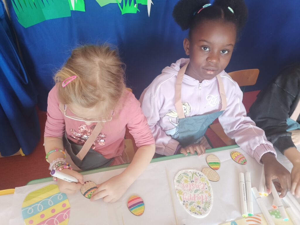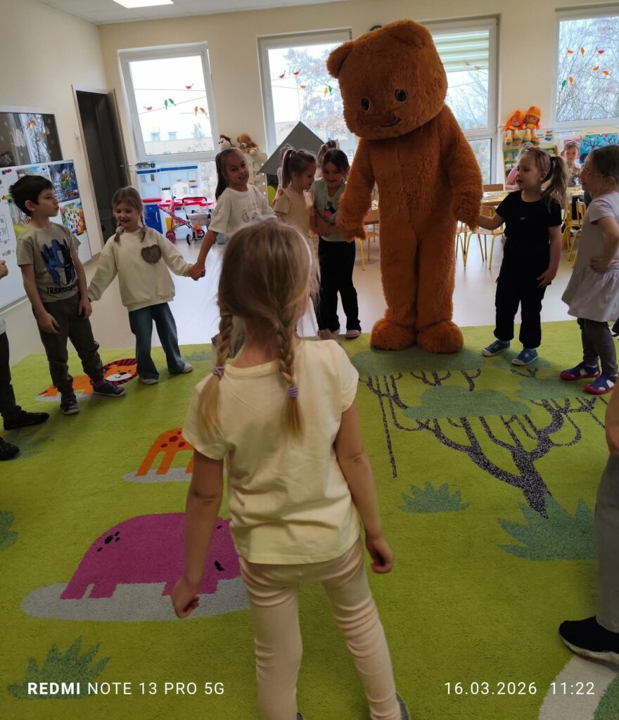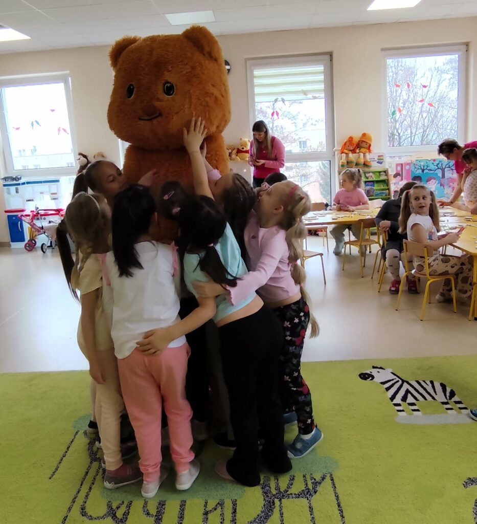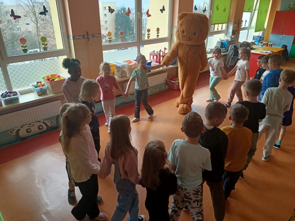 i zaangażowaniem wykonały pisanki i baranka, aby ozdobić swój świąteczny koszyczek. Gościem specjalnym był gigantyczny, pluszowy Miś, który przyniósł dzieciom dużo radości. Warsztaty przebiegły w świątecznej atmosferze.