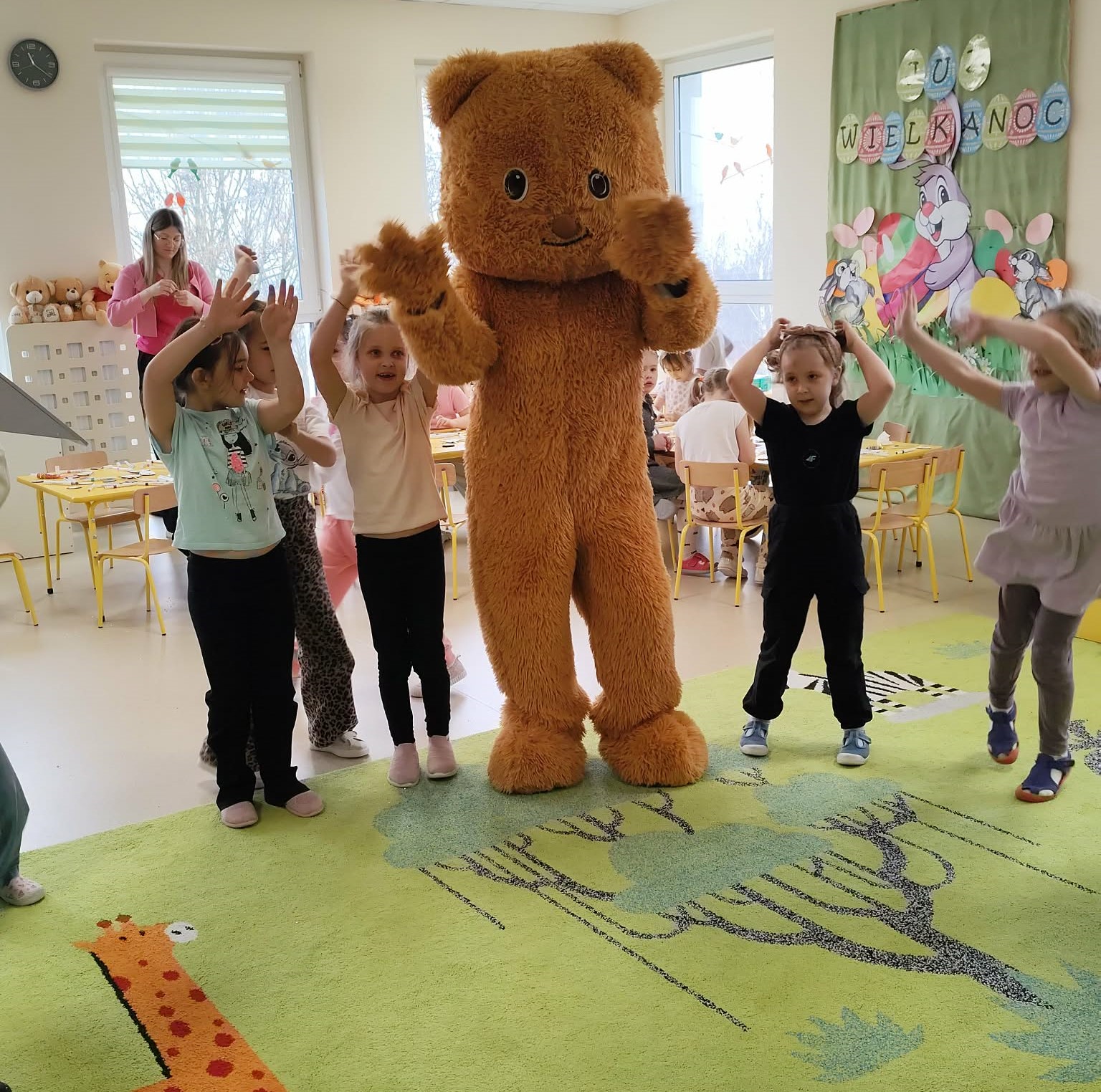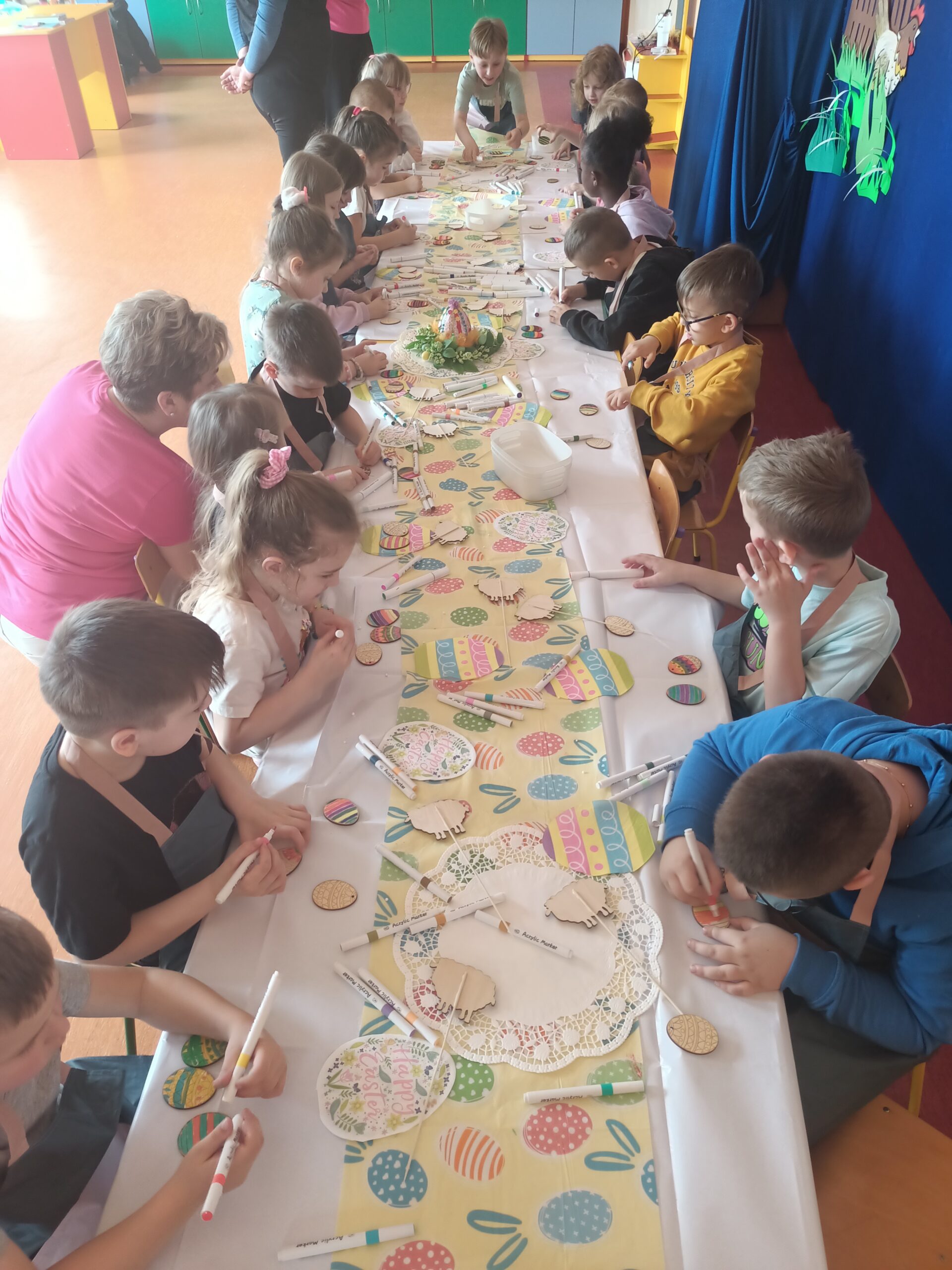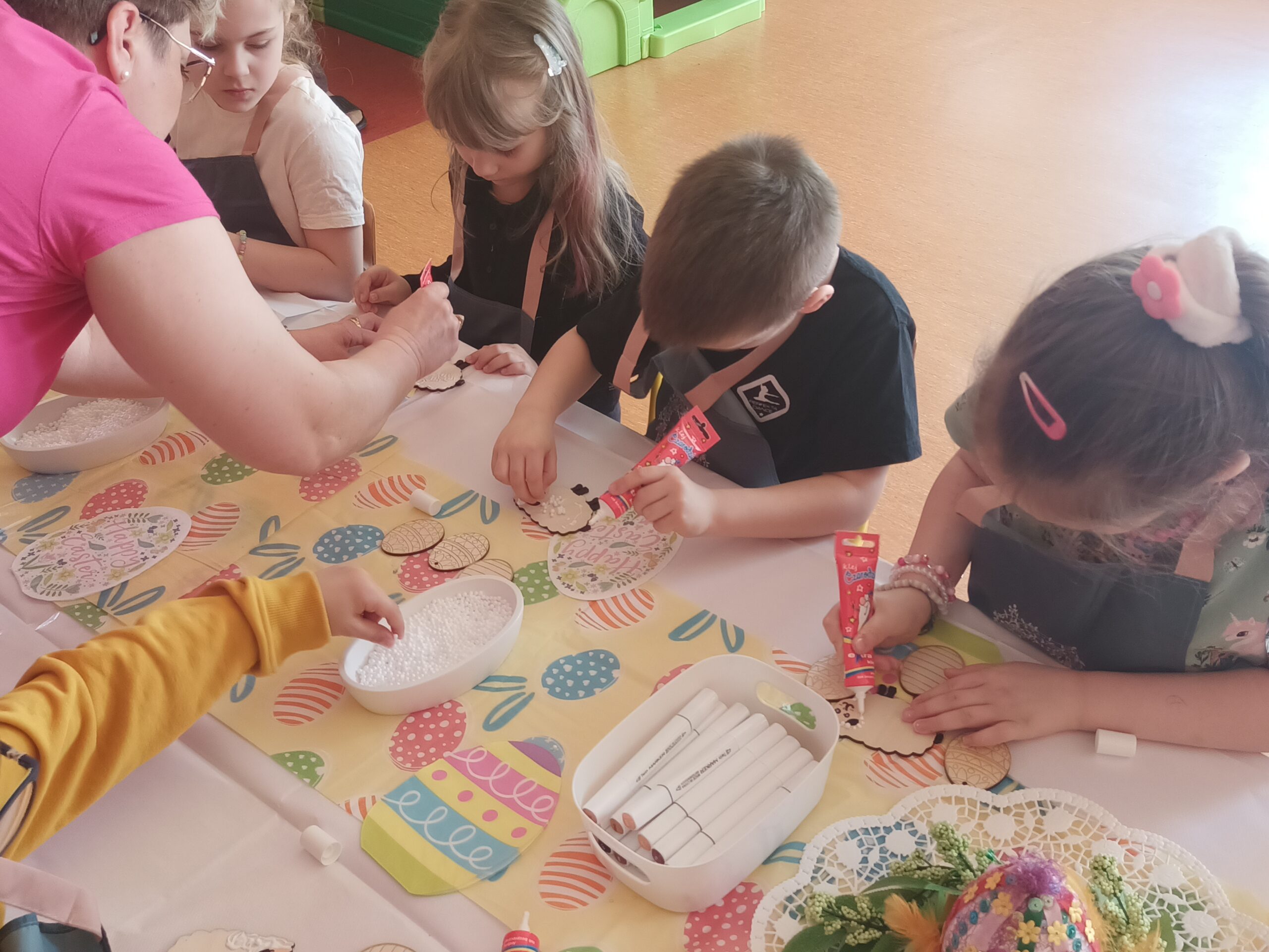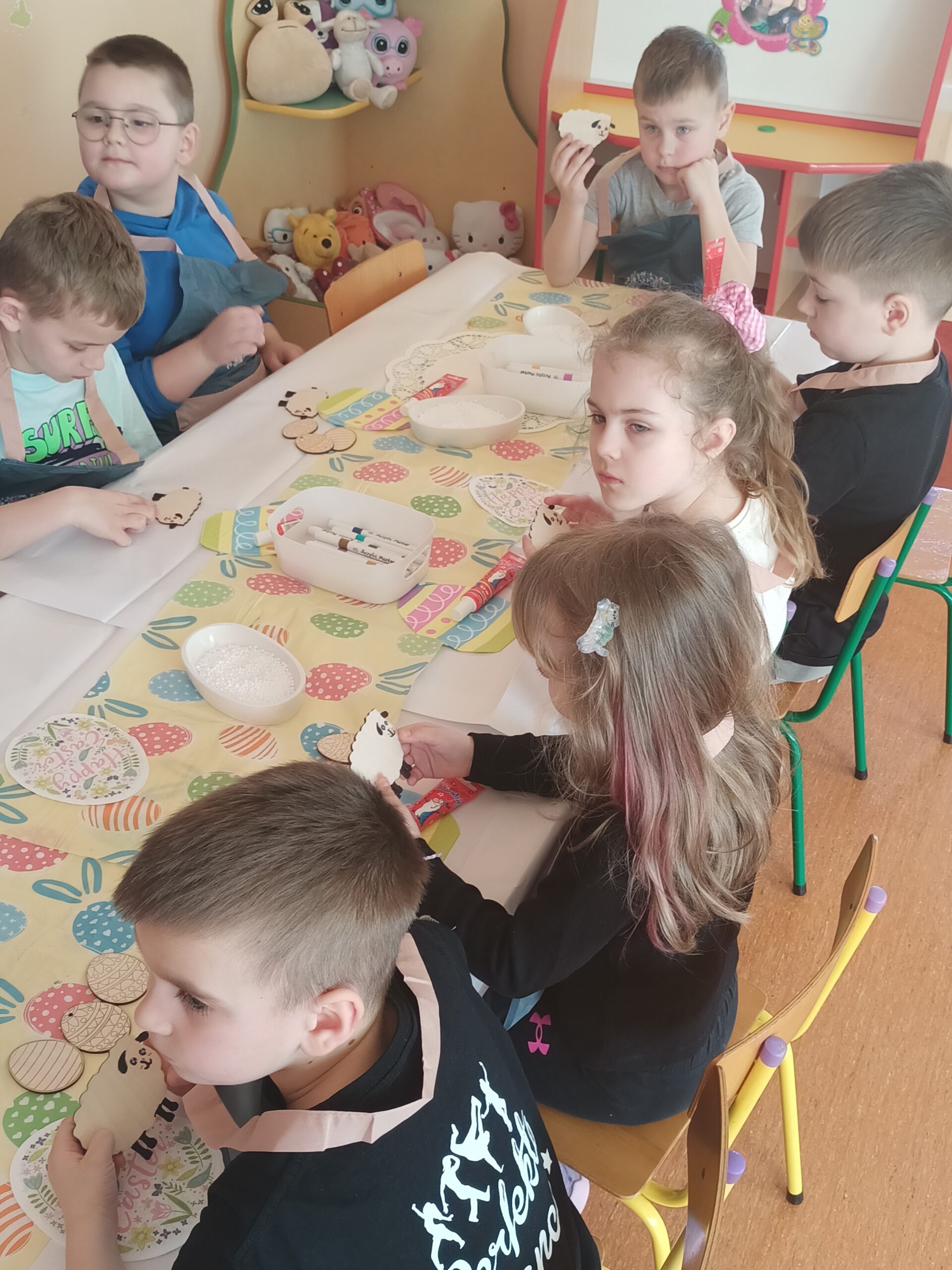i zaangażowaniem wykonały pisanki i baranka, aby ozdobić swój świąteczny koszyczek. Gościem specjalnym był gigantyczny, pluszowy Miś, który przyniósł dzieciom dużo radości. Warsztaty przebiegły w świątecznej atmosferze.