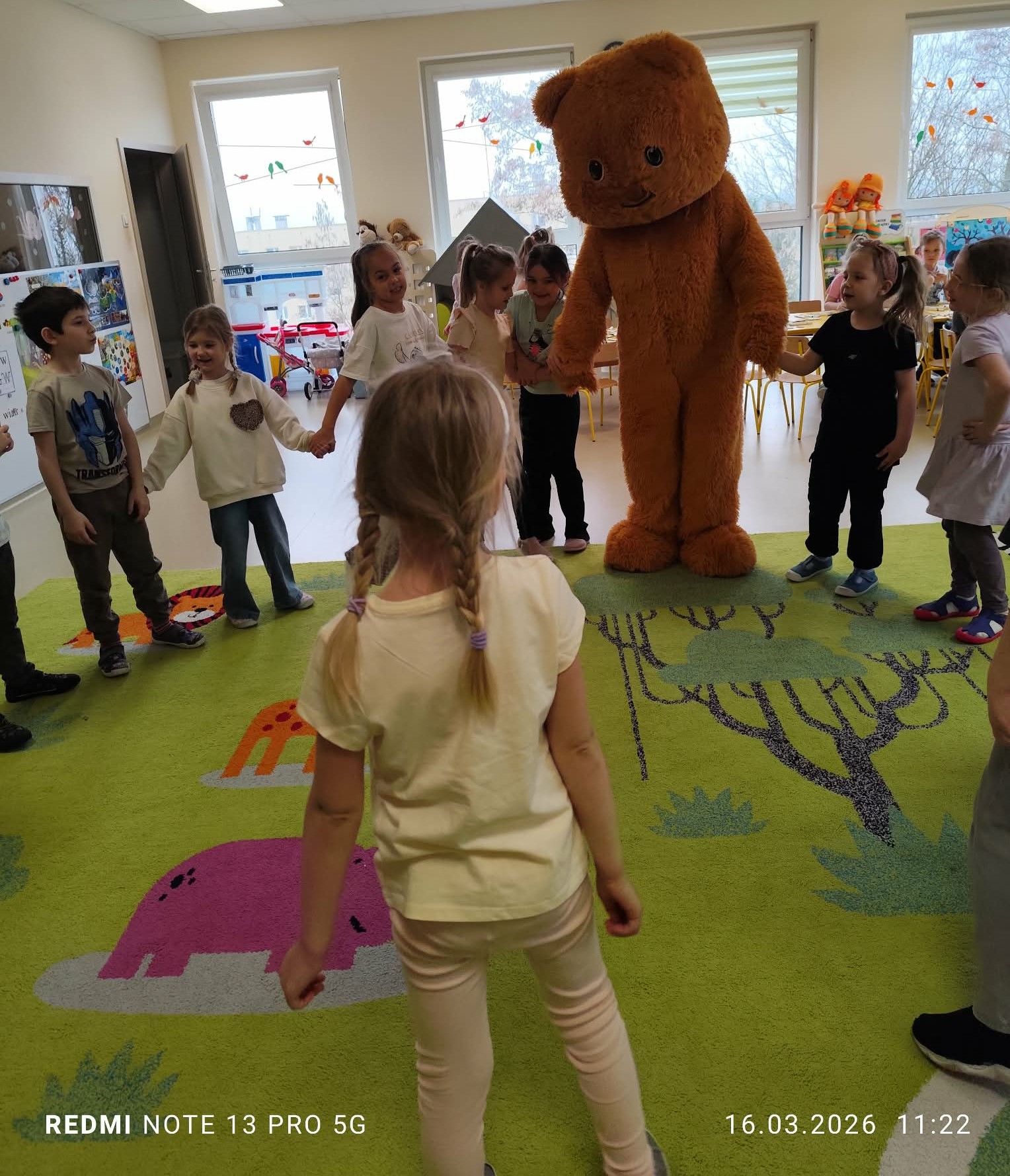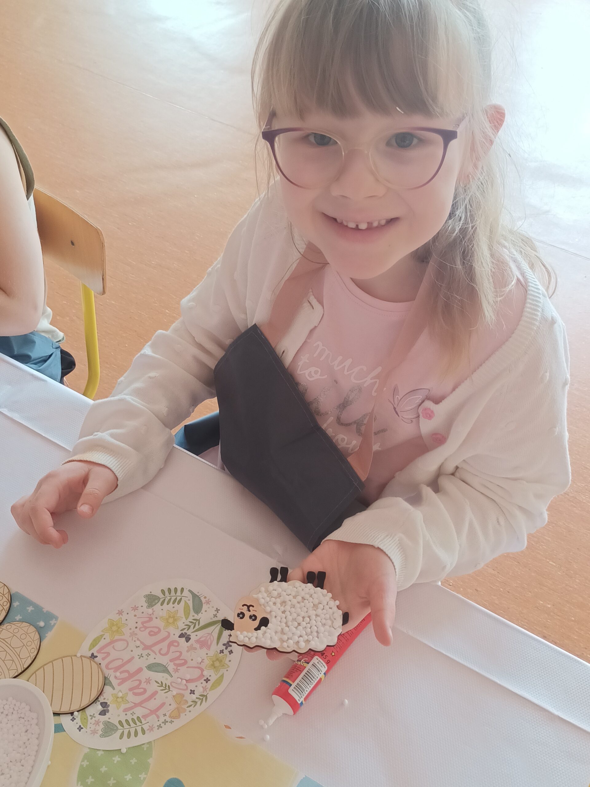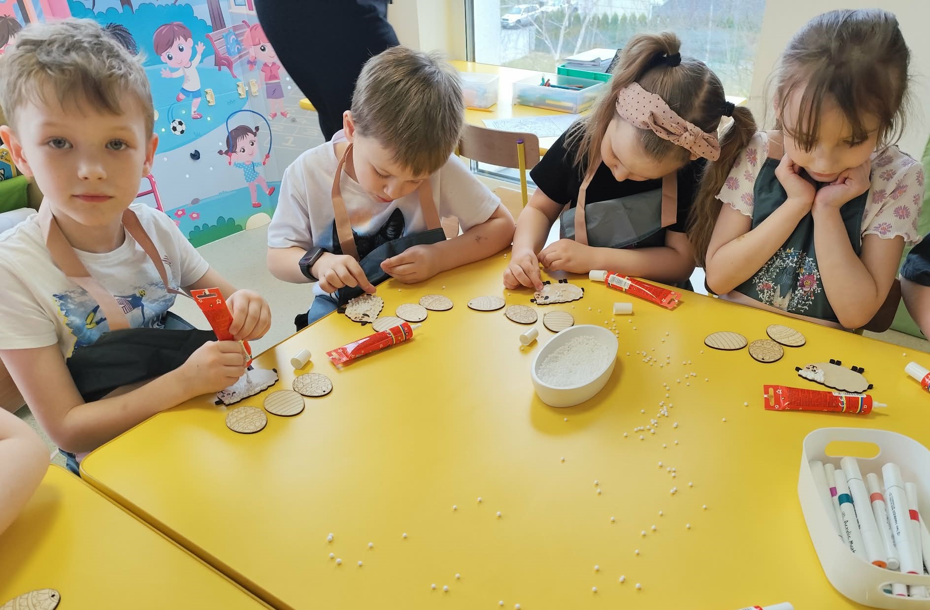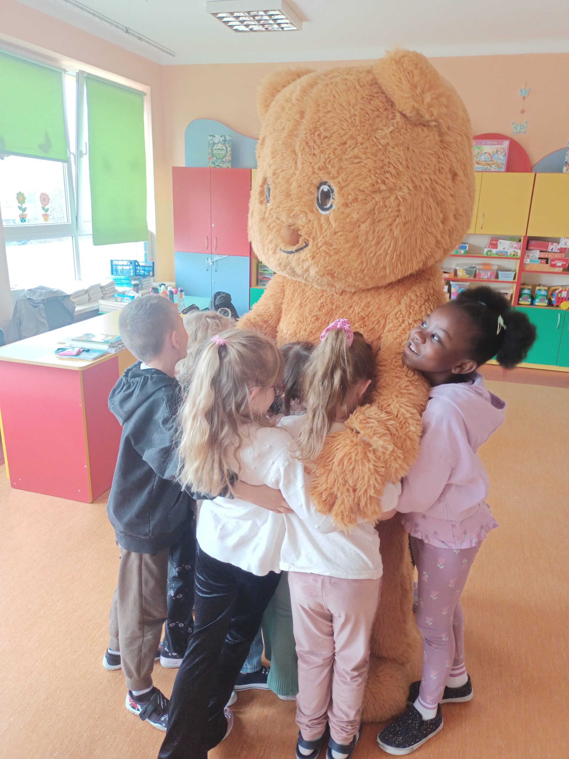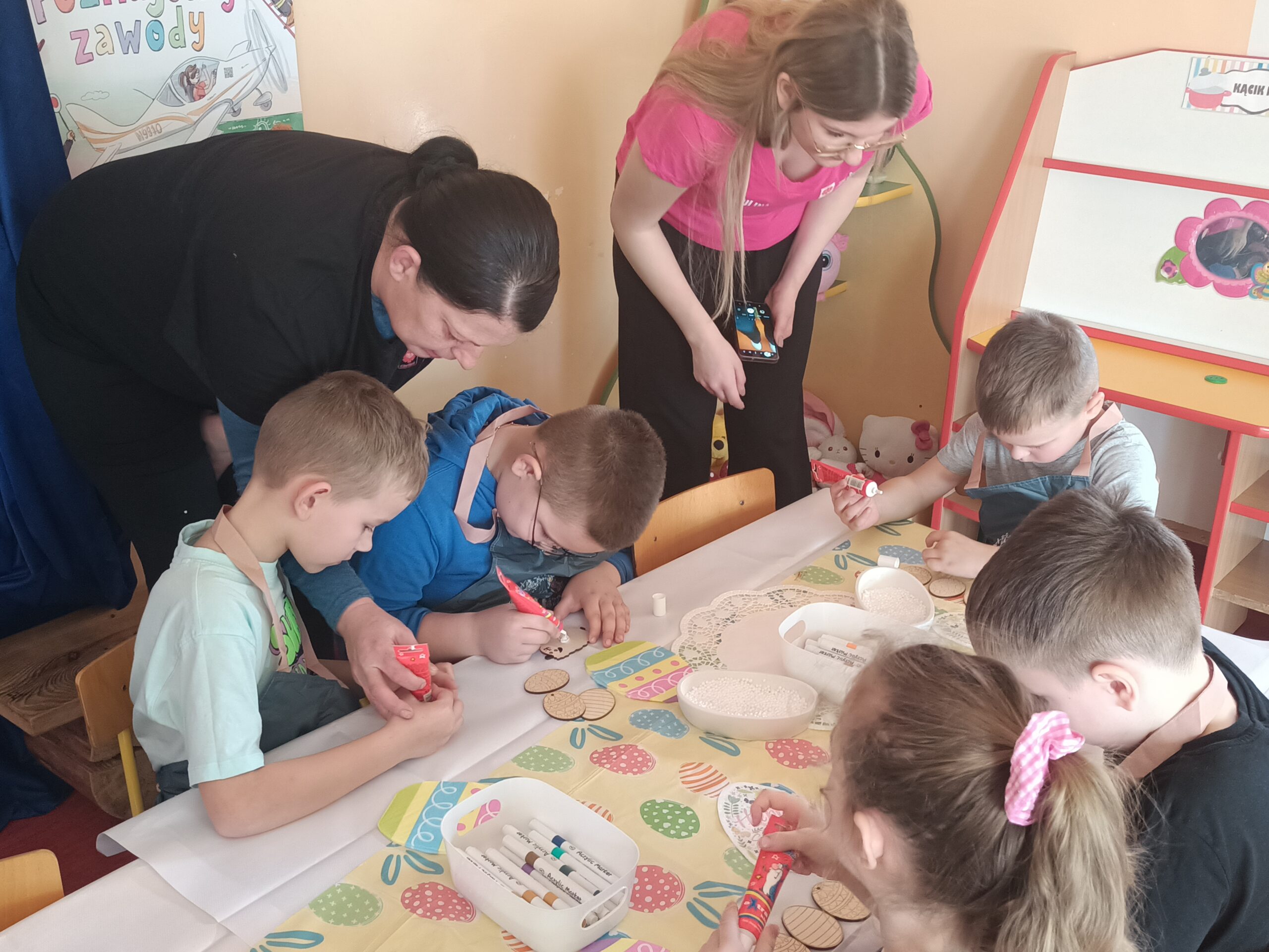 i zaangażowaniem wykonały pisanki i baranka, aby ozdobić swój świąteczny koszyczek. Gościem specjalnym był gigantyczny, pluszowy Miś, który przyniósł dzieciom dużo radości. Warsztaty przebiegły w świątecznej atmosferze.