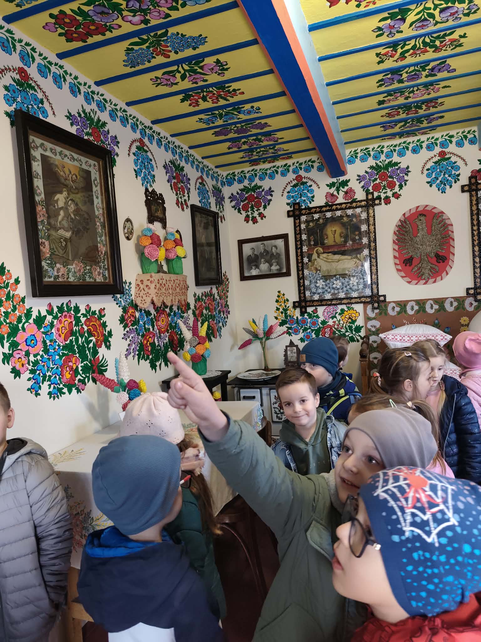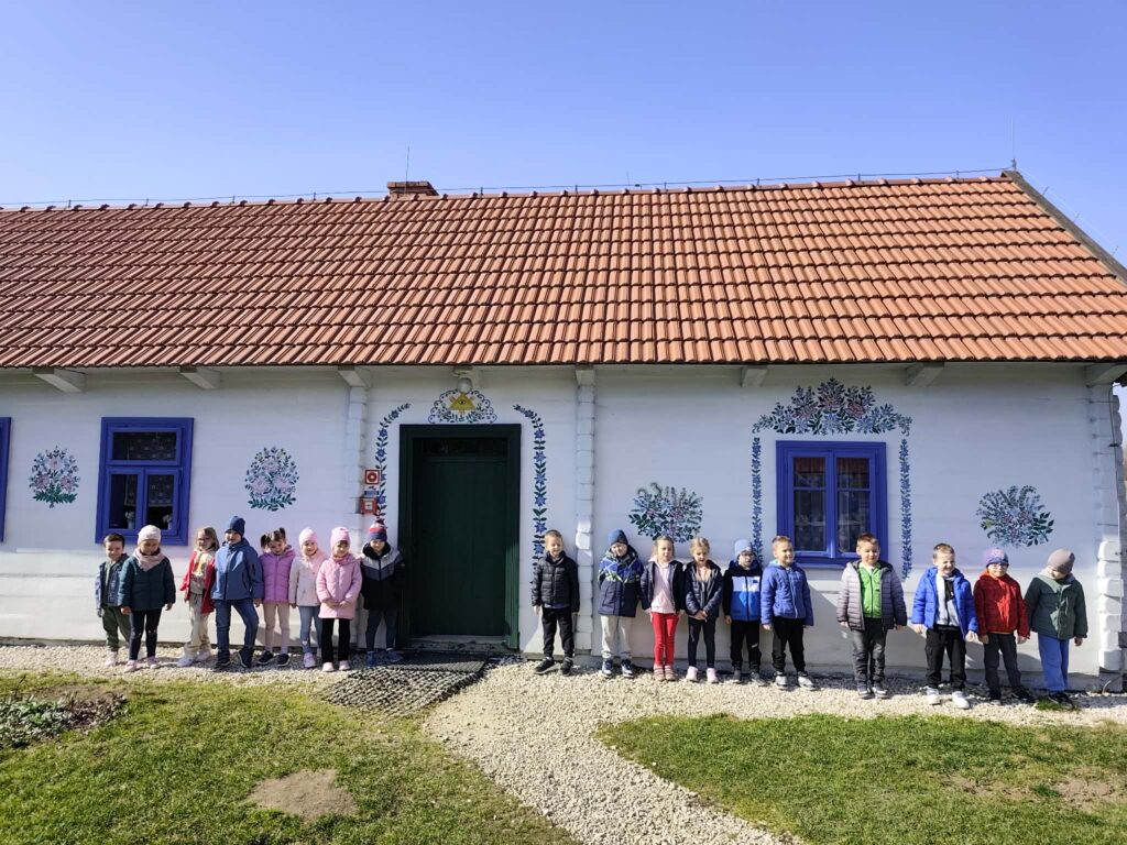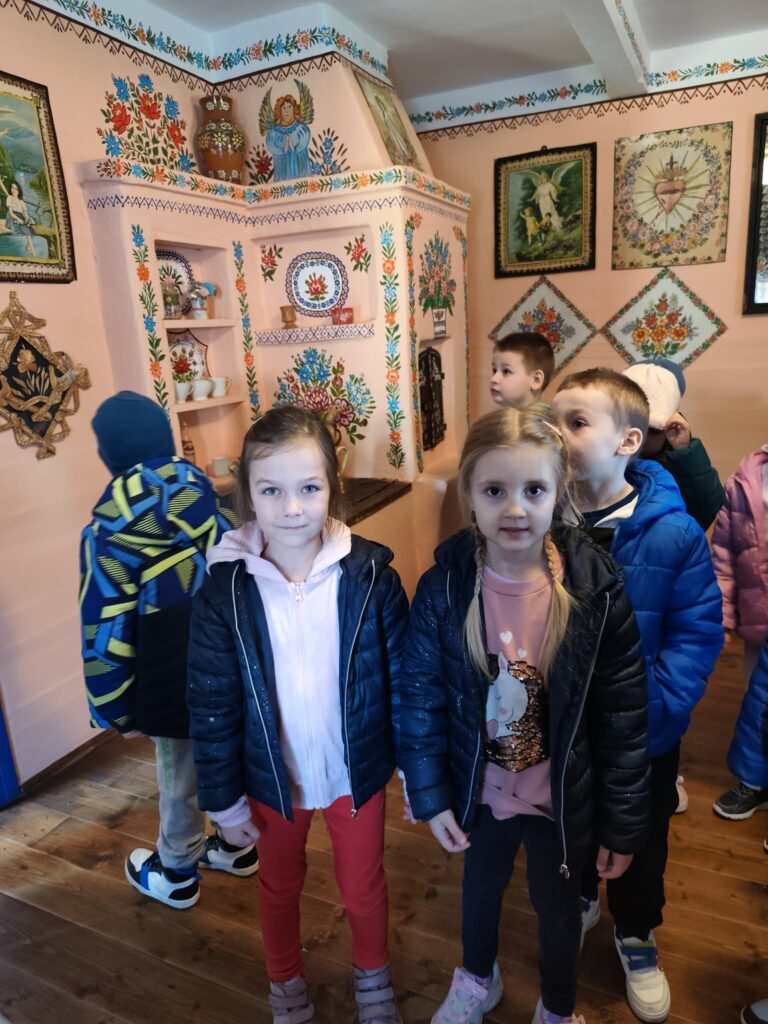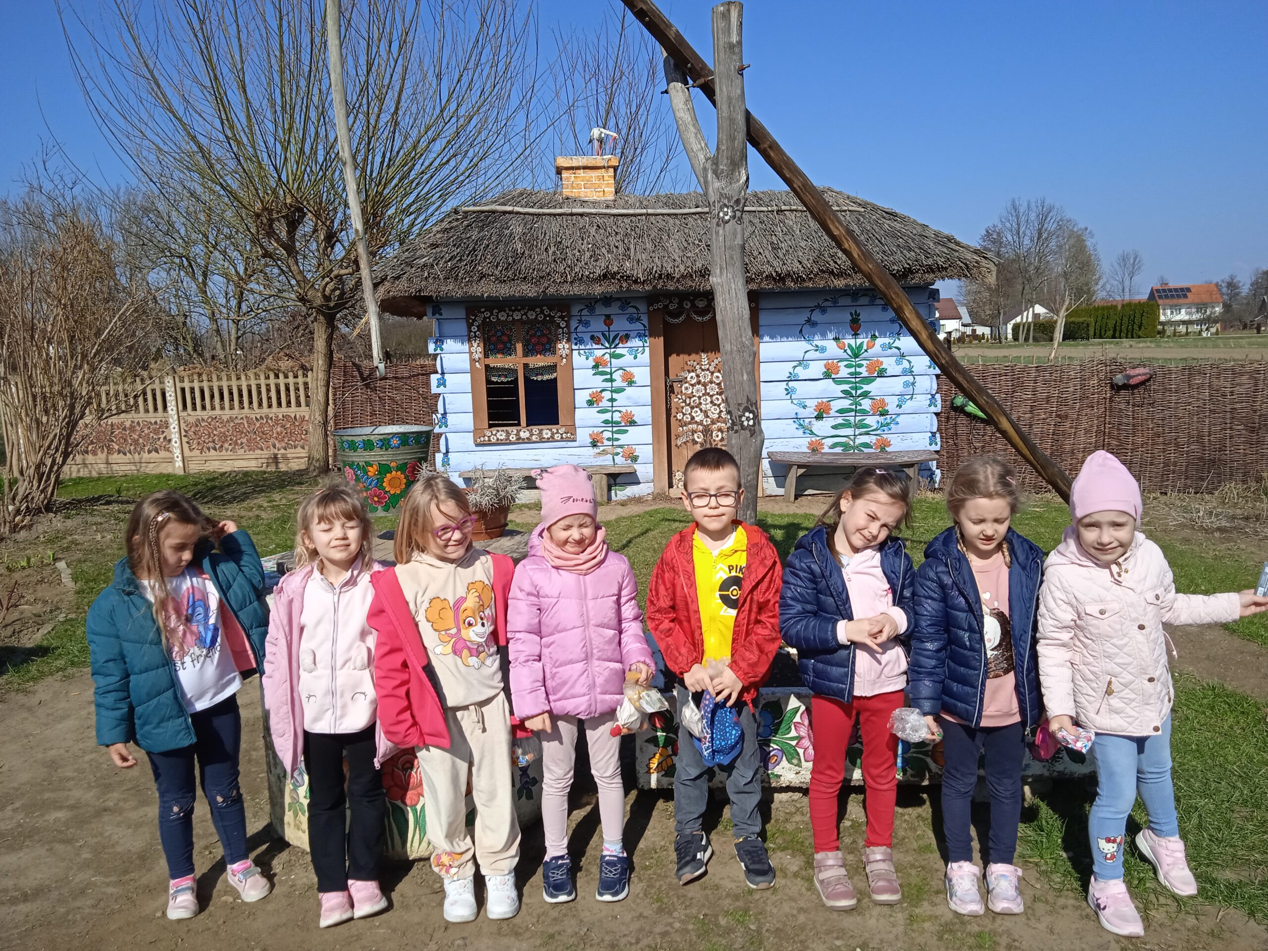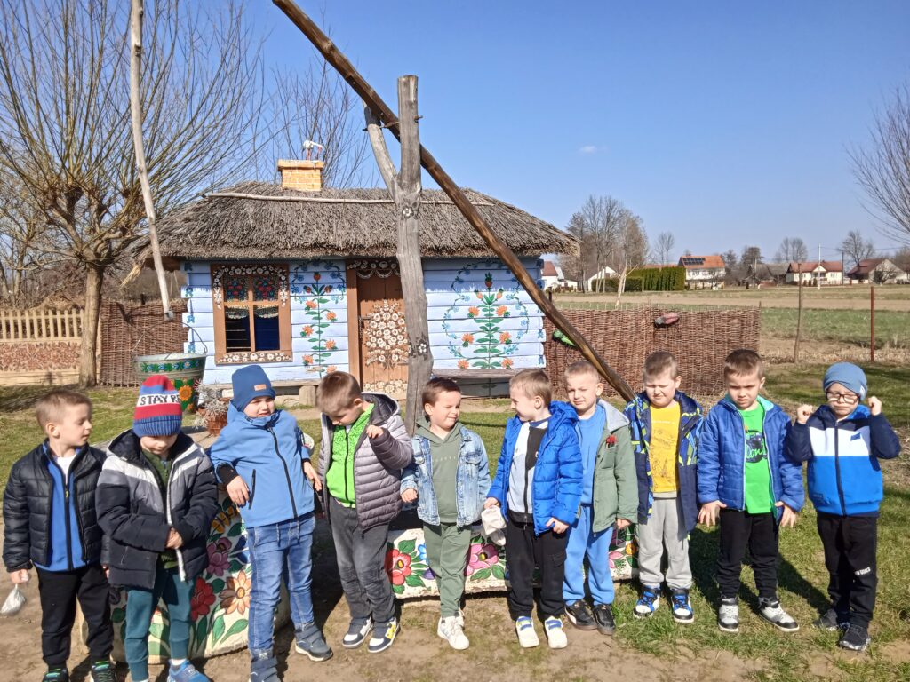 Grupa Szafirki wybrała się na wycieczkę do Zalipia – miejscowości słynącej z pięknie malowanych domów. Dzieci miały okazję obejrzeć wyjątkowe domki ozdobione tradycyjnymi, kolorowymi motywami kwiatowymi, które wzbudziły ich zachwyt i zainteresowanie sztuką ludową. Podczas pobytu odbyły się również warsztaty wielkanocne. Dzieci z zaangażowaniem tworzyły palmy wielkanocne oraz malowały jajka, rozwijając swoją kreatywność i zdolności manualne.