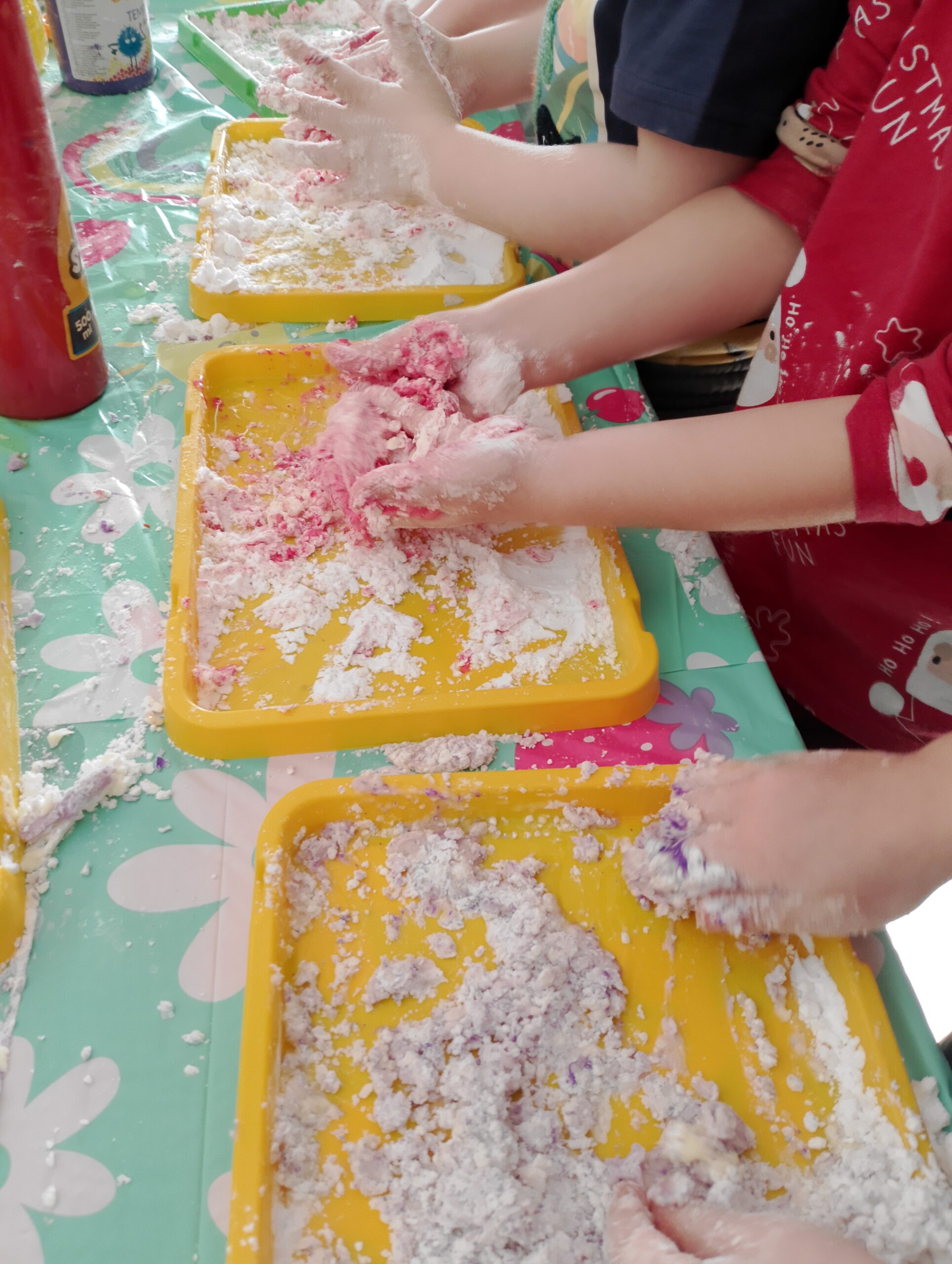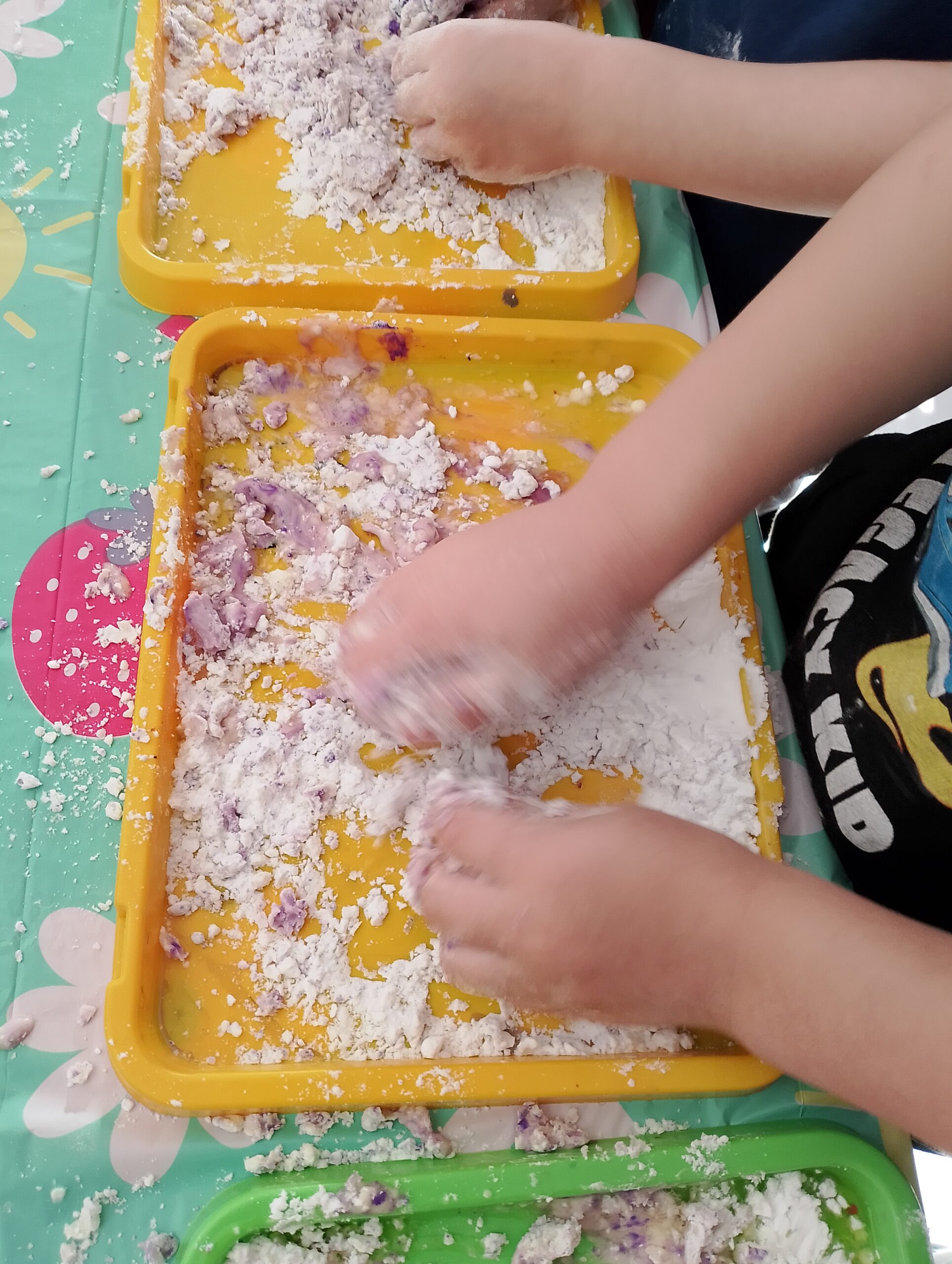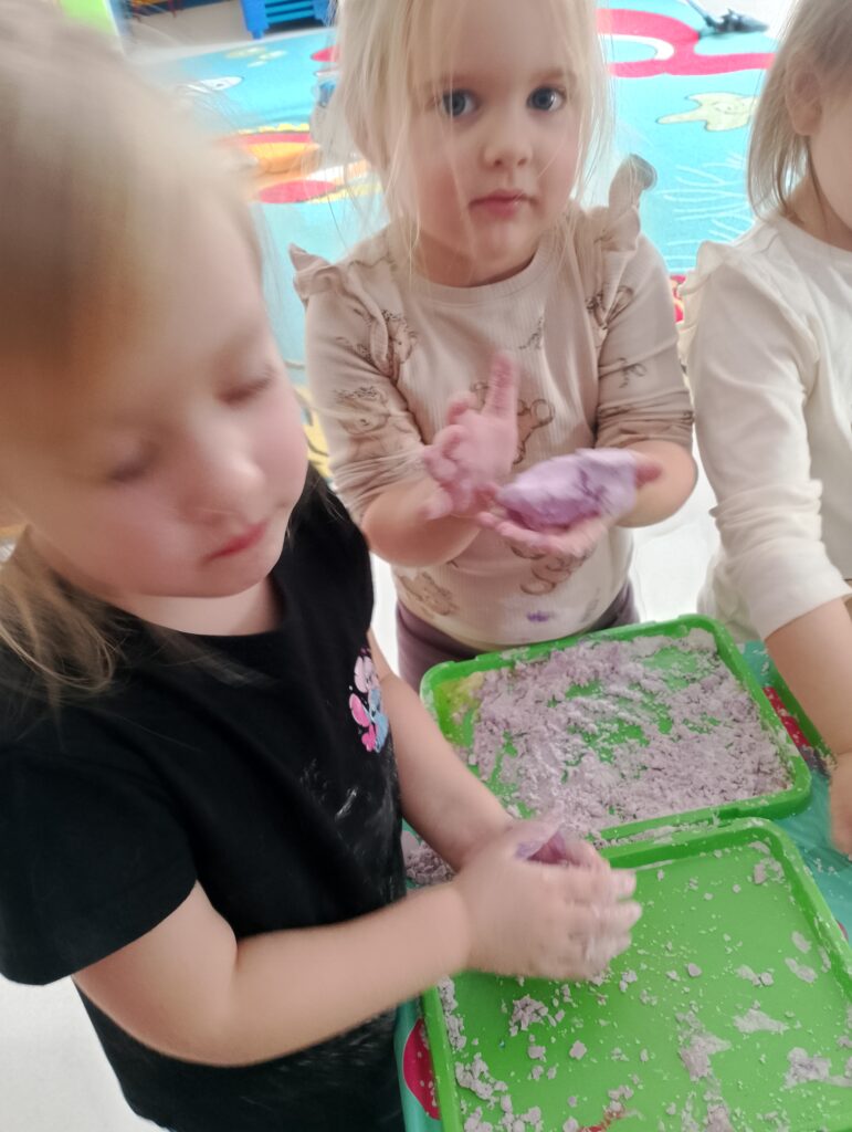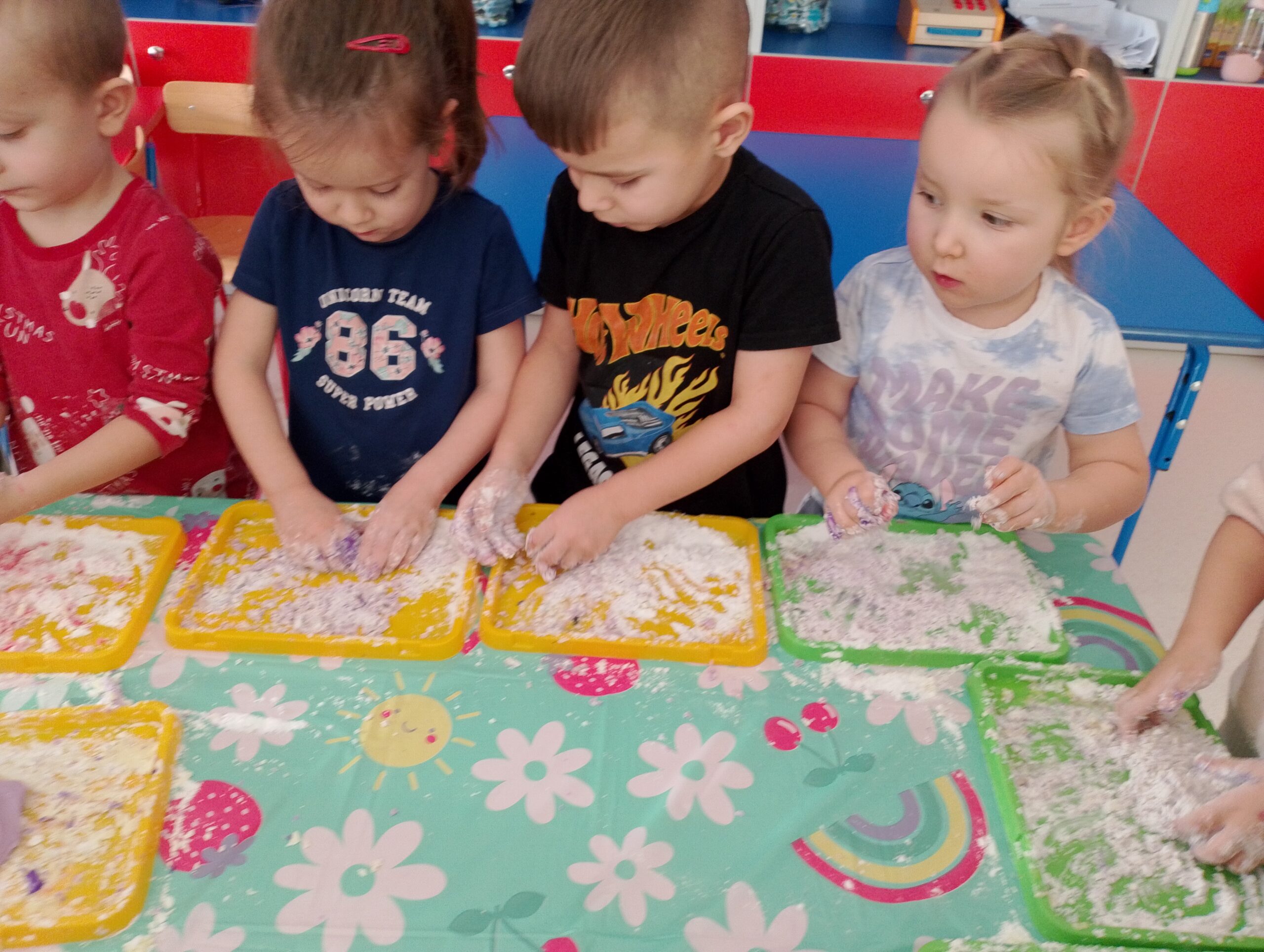 Podczas aktywności wykorzystywane były m.in. produkty spożywcze i materiały plastyczne bezpieczne dla dzieci. Dzieci rozwijały zmysł dotyku, wzroku oraz koordynację ręka–oko. Zajęcia sprzyjały również rozwijaniu kreatywności, samodzielności oraz integracji w grupie.